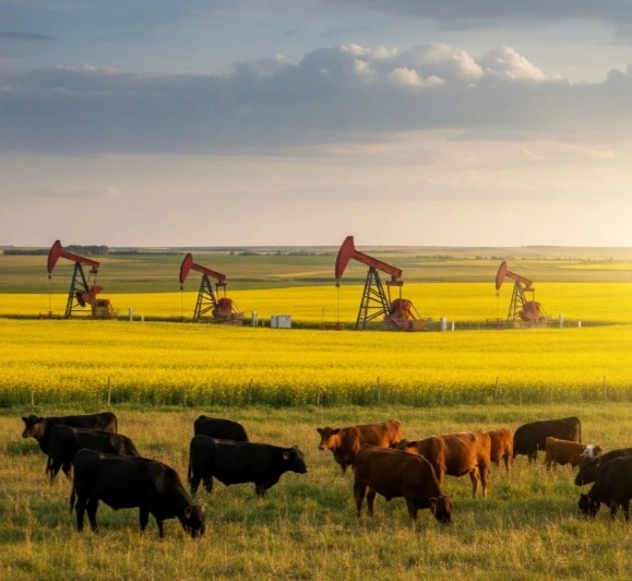 카놀라 꽃이 만개한 평원은 황금빛 물결을 이루며, 그 사이사이에선 오일펌프가 마치 거대한 메뚜기처럼 열심히 움직이고 있다.