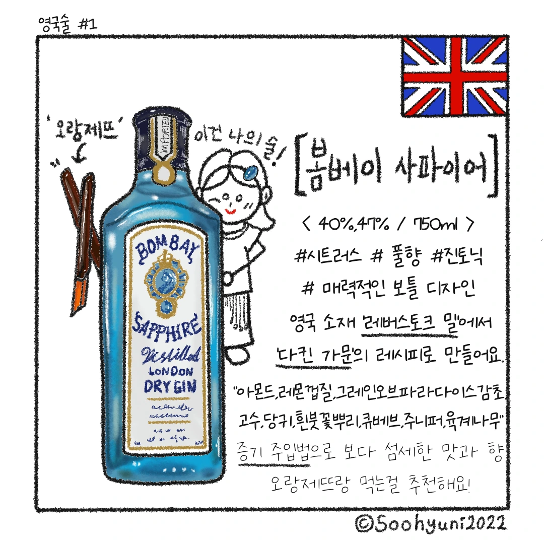 그리고 봄베이사에 런던 드라이 진은 아니고, 디스틸드 진 (증류진)도 있다고 한다. 베리 향이 인퓨징 된 ’봄베이 브램블’인데, 기회가 된다면 먹어보고 싶은 술이다.