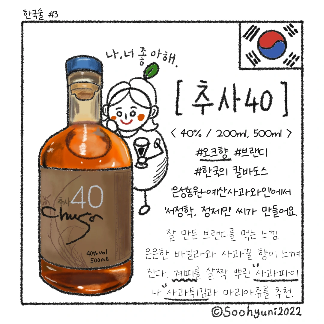 40도라는 도수가 무색하게 부드럽고 은은해서, 증류주가 처음이라고 하더라도 한 번쯤 권해보고 싶은 술.