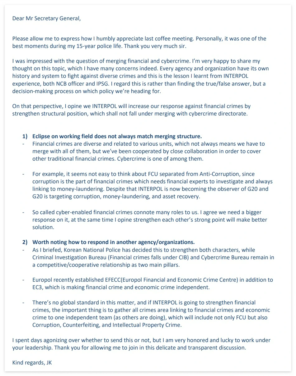 왜냐하면 소속 부서별 역량과 리더십, 역할과 재량이 다르기 때문에 구조를 어떻게 개편하는지는 조직 사업에 직접적으로 영향을 주는 중요한 문제다. 가령 인터폴 사무총국에서 사이버국과 금융팀을 이른바 '사이버금융팀'으로 명명한다면, 회원국에게 그간 진행되어온 현안들에 관한 주무 부서는 어떻게 정리될 것인지, 그리고 앞으로의 협업 방식에 관한 설명 등도 함께 고려되어야 한다.
