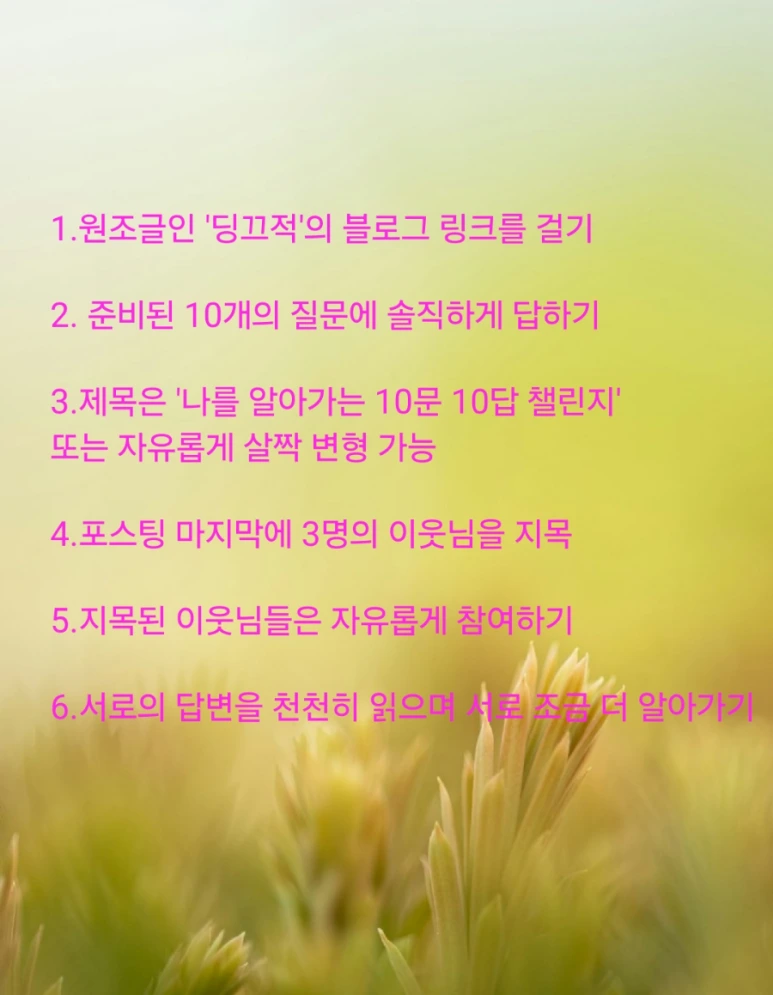 3. 제목은 '나를 알아가는 10문 10답 챌린지' 또는 자유롭게 살짝 변형 가능