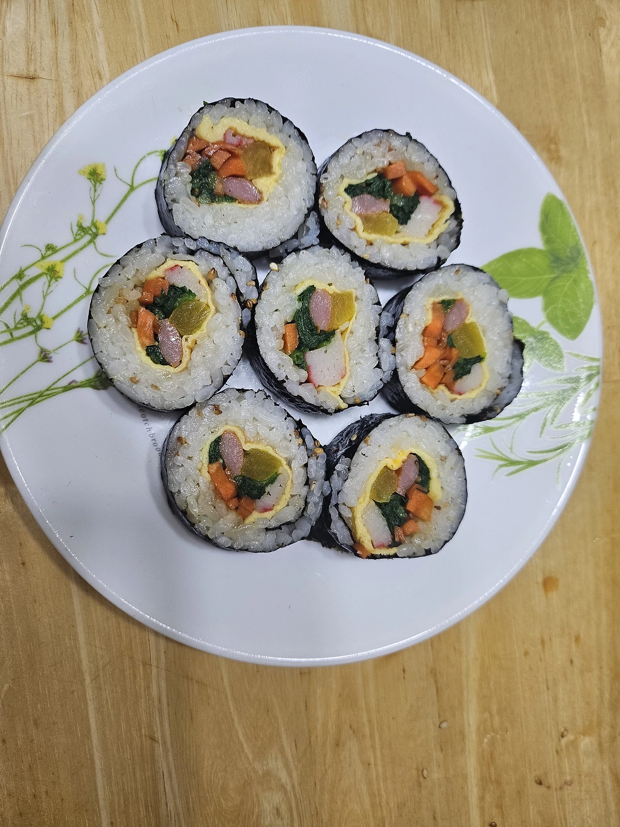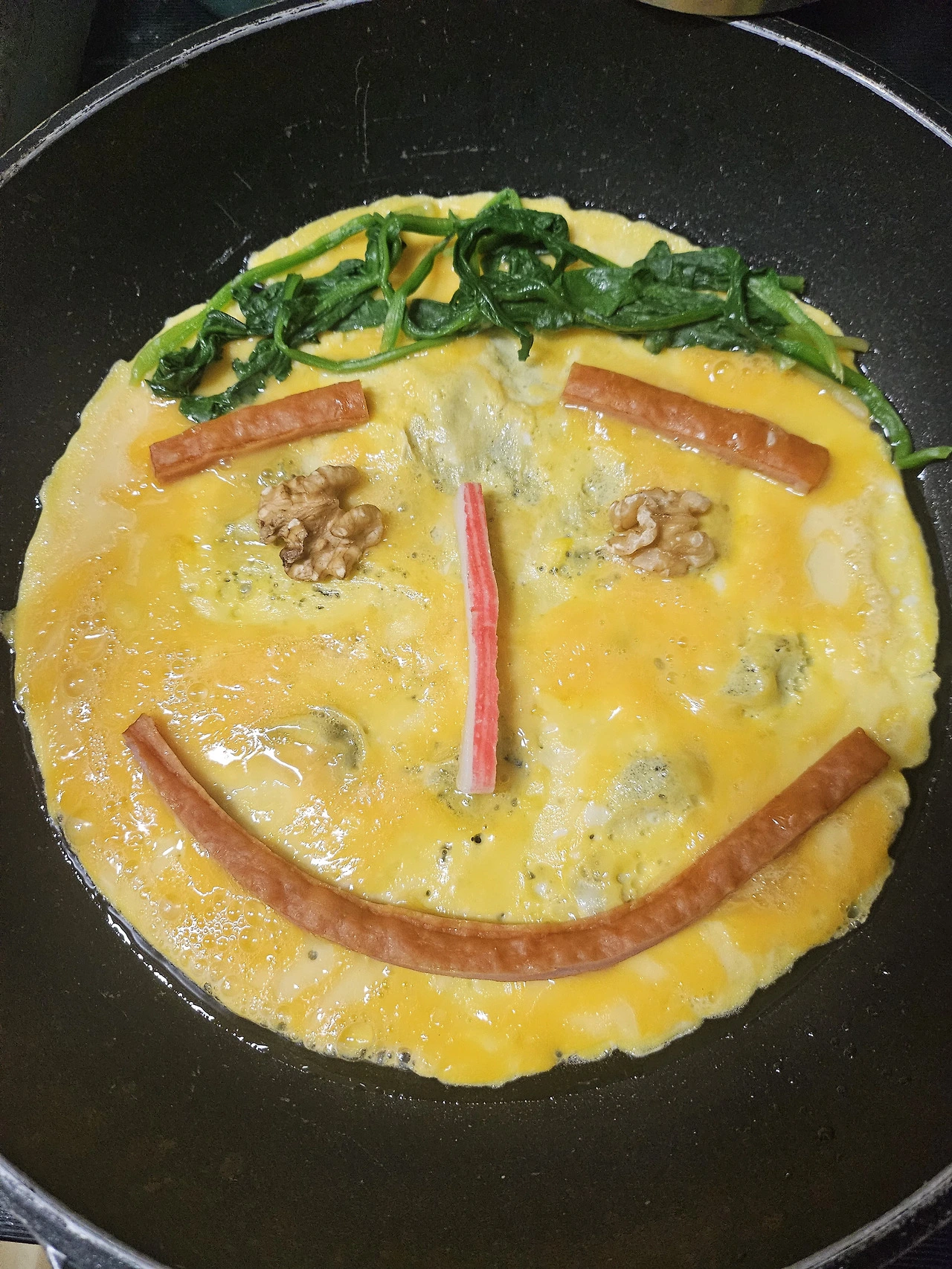 순간 계란 아트가 떠올라서 햄, 맛살, 시금치를 이용해서 만들기 시작했다.