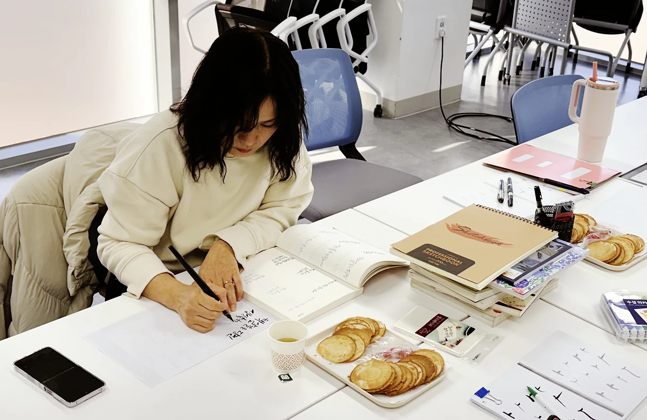 글씨는 그려야 제맛이다! 다른 샘들과 이야기를 나누면서 시간은 성큼 지나간다. 난 11시에 수업이 있어서 10시 40분까지 하고 센터로 달렸다는 건 안 비밀!