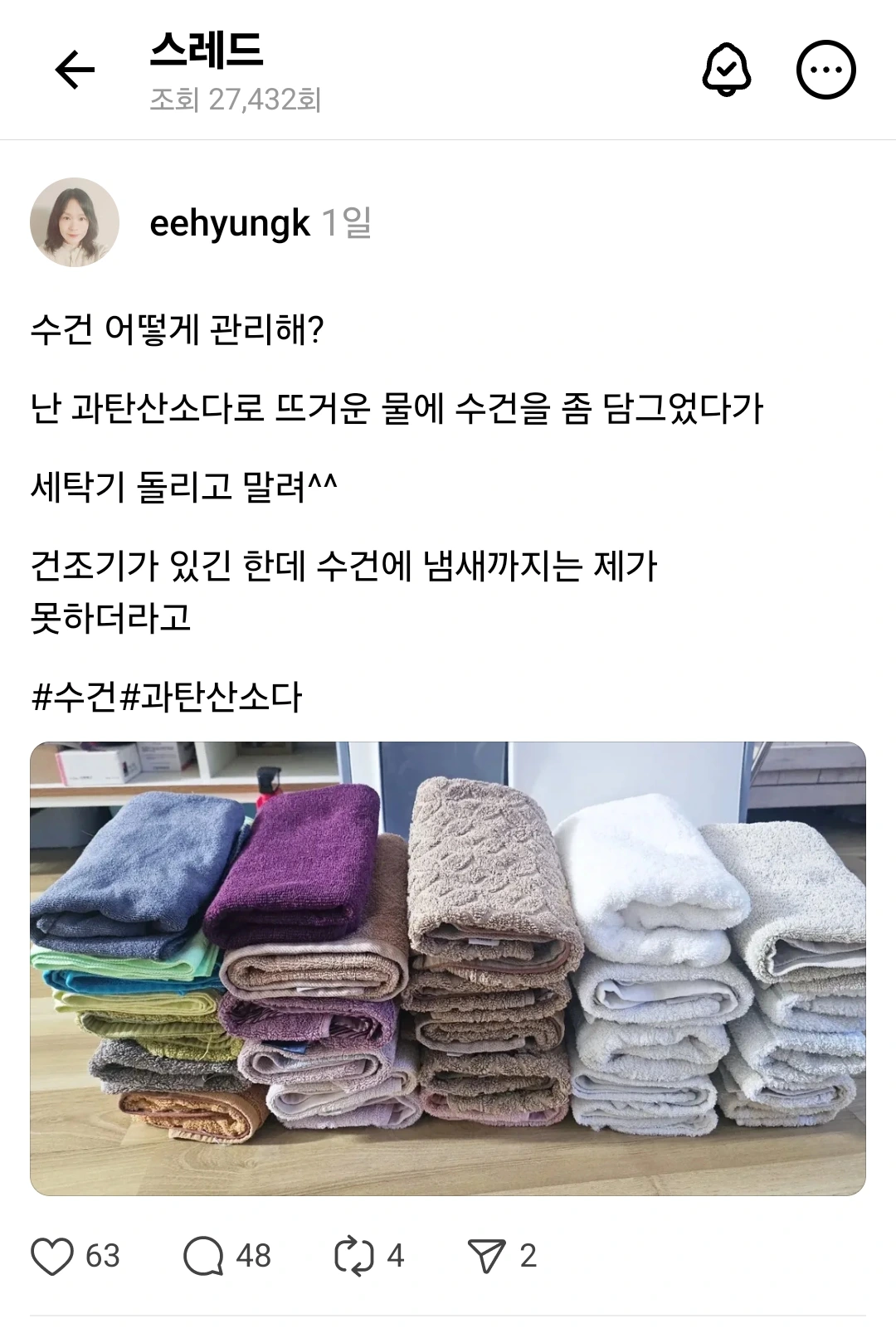 아침에 수건을 개면서 수건에서 냄새 날때 과탄산소다에 담가 놓고 빤다. 수건 어떻게 관리해?에 대한 글을 올렸더니 조회 수가 장난 아니었다. 조회 수가 27400이 넘었다. 다양한 정보를 주시려고 답글을 달아주시고 그리고 팔로워를 해주는 분들께 너무 감사하다.