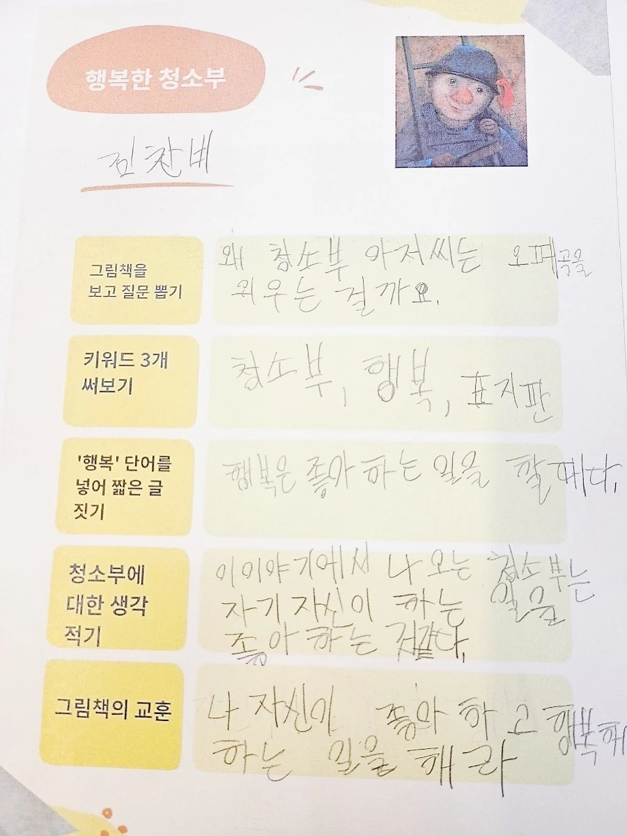 센터에 들어온 지 얼마 되지 않은 중3 여자아이가 있다. 4번째 수업을 《행복한 청소부》으로 진행을 하였다. 표지만 봐도