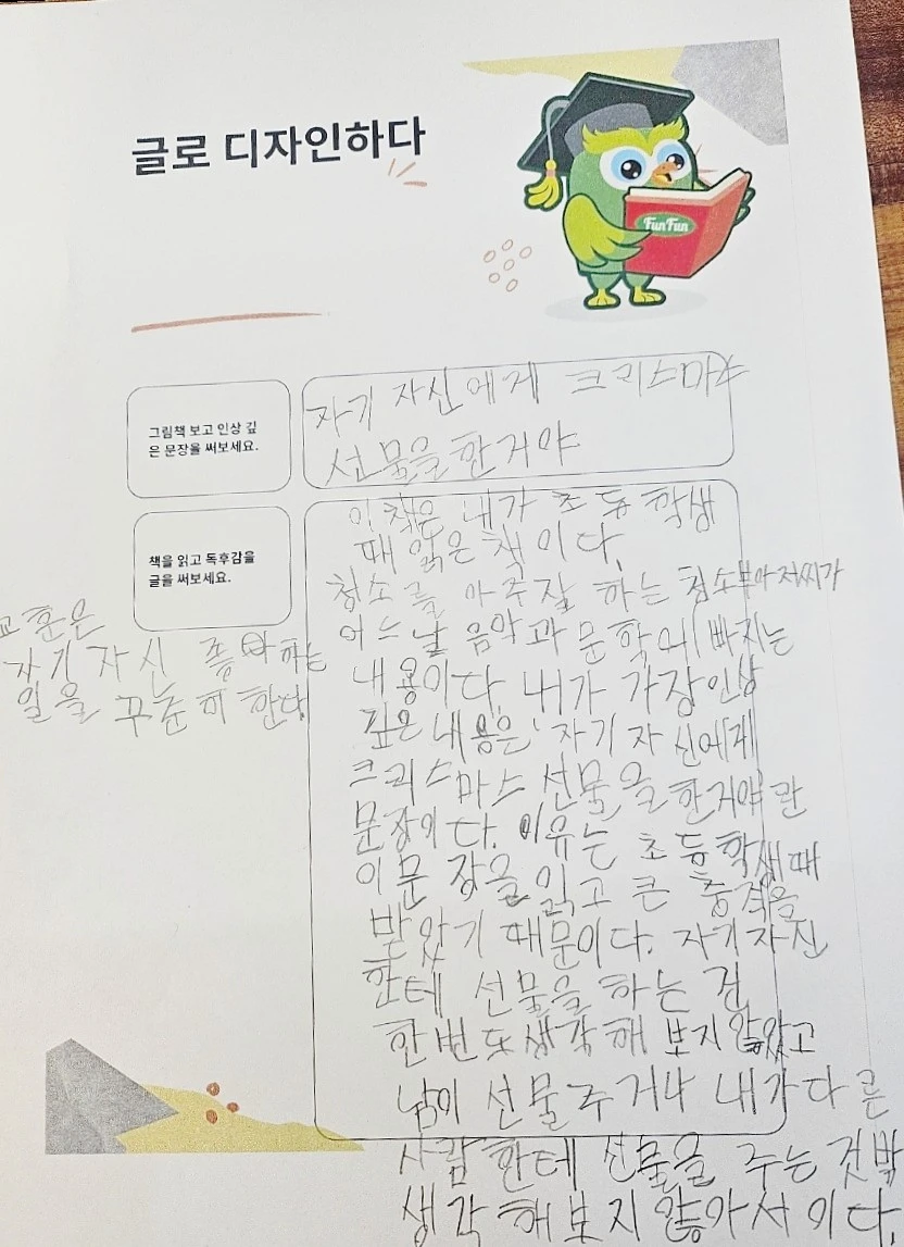 차츰 글 밥이 늘어간다. 처음에는 몇 줄을 쓰는데 시간이 오래 걸렸다. 다른 아이들도 마찬가지 비슷하다! 나 또한 한 주제로 많은 분량으로 글을 쓴다는 건 어렵다. 한 달에 4번 글을 쓰는데도 아이들은 글쓰기가 느는 것 보면 신기하다. 글을 읽고 생각을 하고 머릿속에 있는 걸 정리하는 게 중요하다.