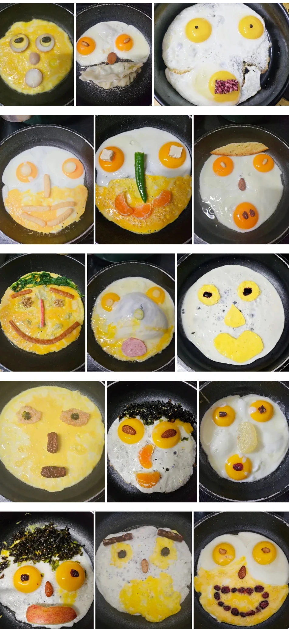 어떤 재료로 눈으로 할까? 어제랑 다른 재료를 고른다. 바로 떠오르는 따끈한 재료로 토핑을 한다. 그리고 작은 프라이팬에 기름을 조금 두르고 계란을 조심조심 깬다. 잘 못 깨면 노른자가 터지거나 계란 껍데기가 들어가는 벽에 부딪힌다. 계란 3개를 깼는데 얼굴 모양이 안 나오면 성형에 들어간다. 숟가락으로 살살 매끄러운 선을 만든다. 달걀이니까 달걀형으로 마사지하듯 만든다. 세게하면 성형 부작용이 생기기 때문에 천천히 해야 한다.