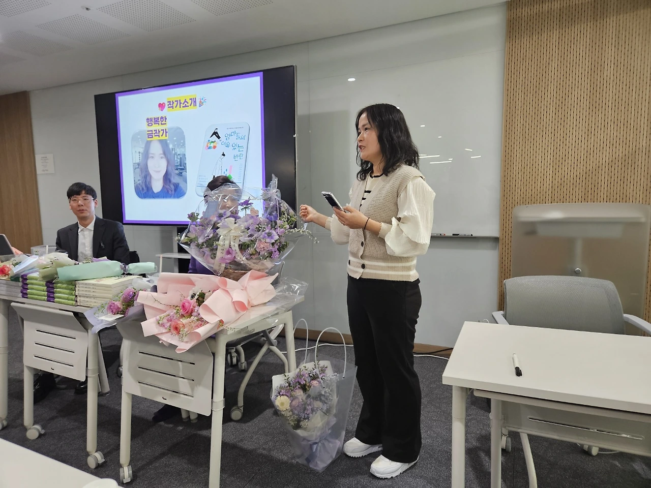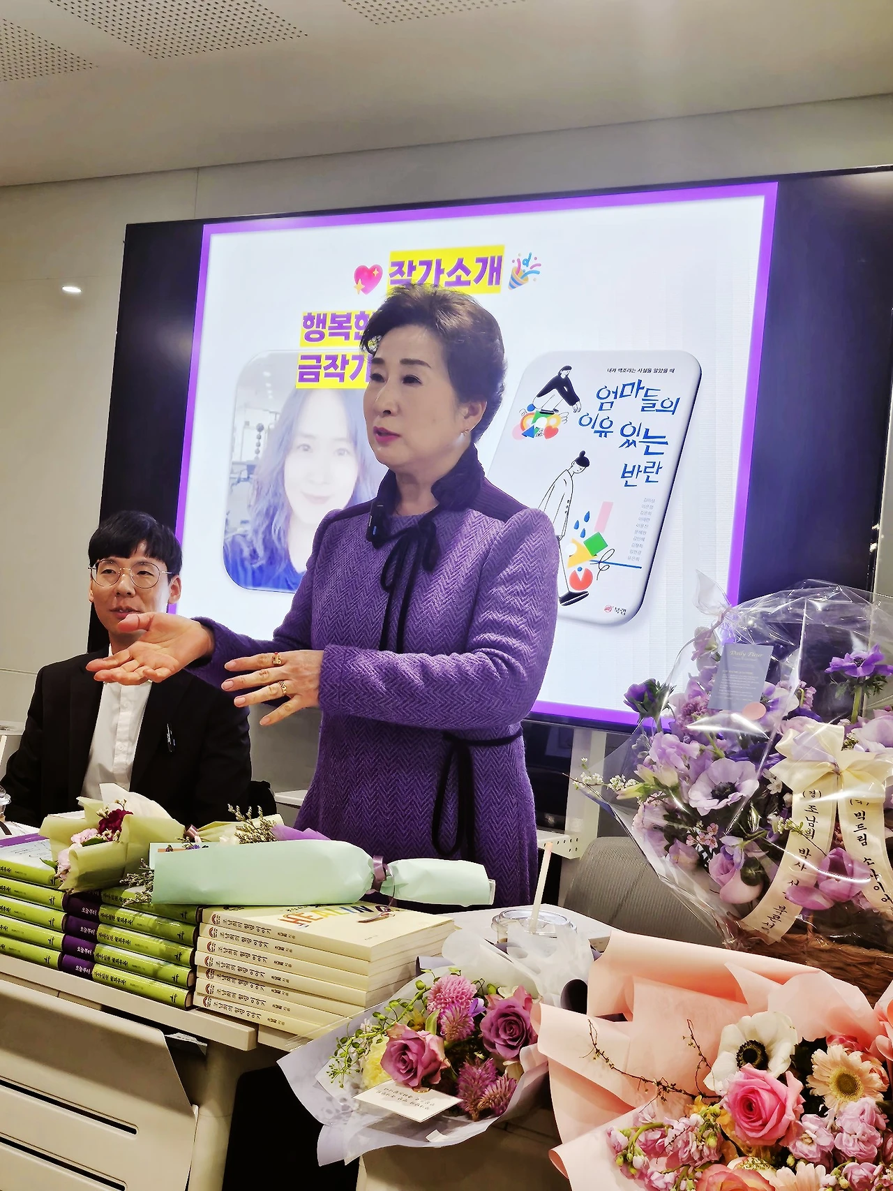 보라색 원피스를 입은 작가님과 몇분이 계셔서 인사를 나누고, 사인을 부탁을 드렸다. 그리고 사진도 찍고 여유 있는 시간으로 북토크할 책상에 꽃다발을 세팅을 하고, 어느덧 2시 정각에 북토크는 시작이 되었다.