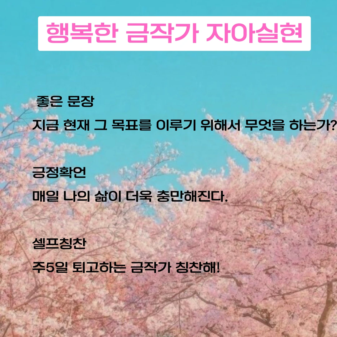 육체적 건강도 중요하지만 정신적 건강을 위해 자아실현 긍정 확언과 셀프 칭찬, 책을 읽고 좋은 문장을 필사를 한다. 긍정 확언, 감사 일기를 쓰면서 하루하루 설레고 기대되는 하루로 시작한다. 건강은 건강할 때 지켜야 한다.