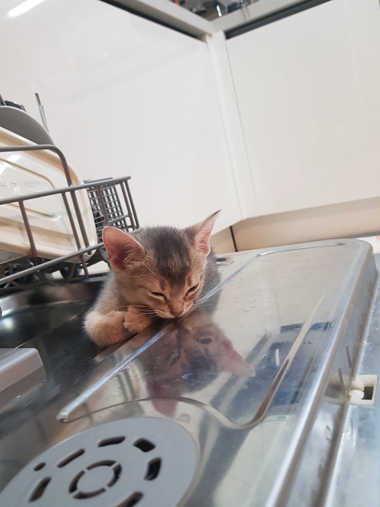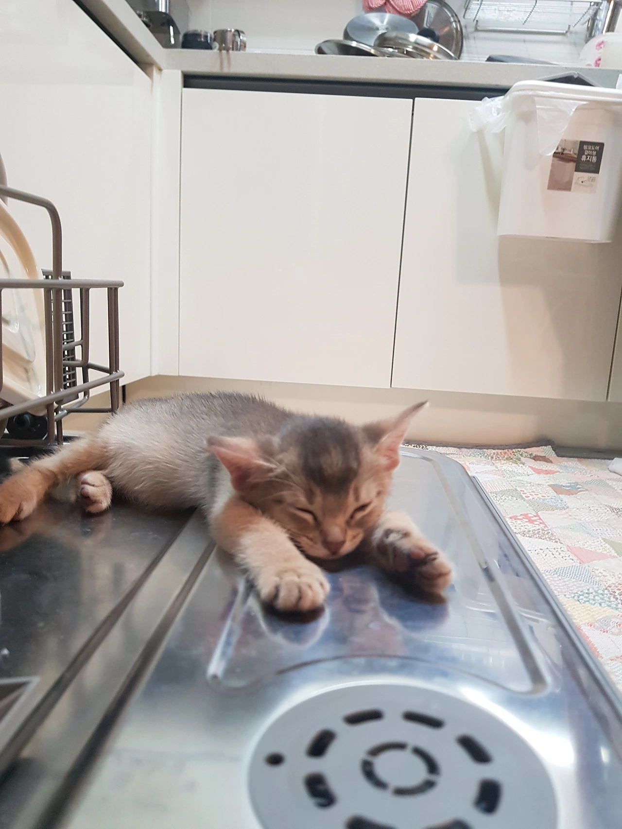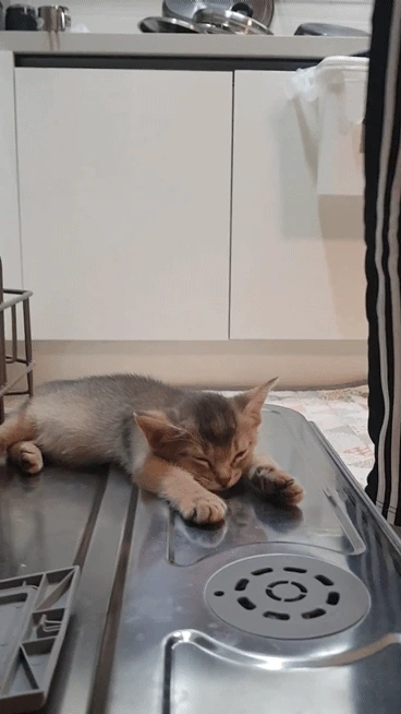 우리가 밥을 먹던 날,아기 단이는 졸음과 싸우면서도근처를 떠나지 않으려고 버티고 있었어요.눈이 스르르 감기고,앞발 끝이 점점 힘을 잃어가면서도“나 여기 있을래…” 하는 듯식기세척기 위에서 꾸벅꾸벅.