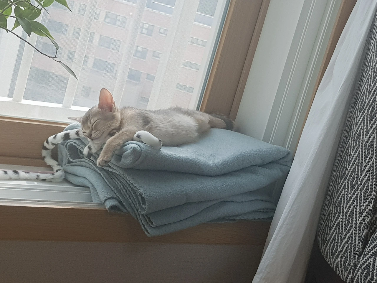 푹신하게 접어둔 담요 위에 작은 몸을 쏙 올려놓고,
