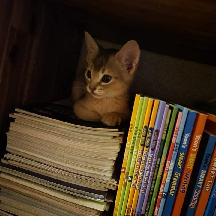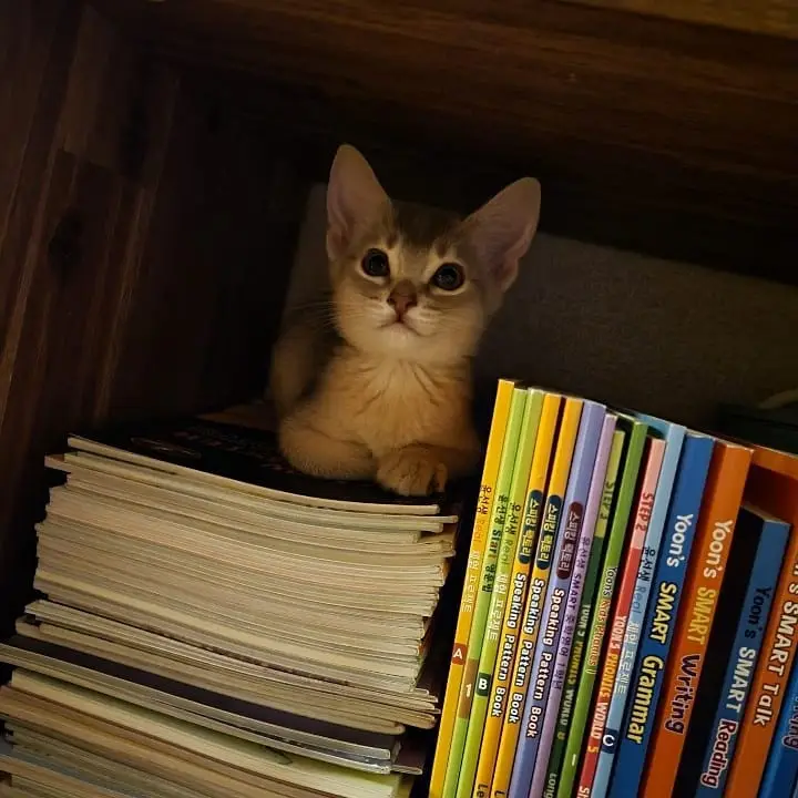 단이가 책장 한 칸을 자기 자리처럼 차지하고 앉아 있었습니다.