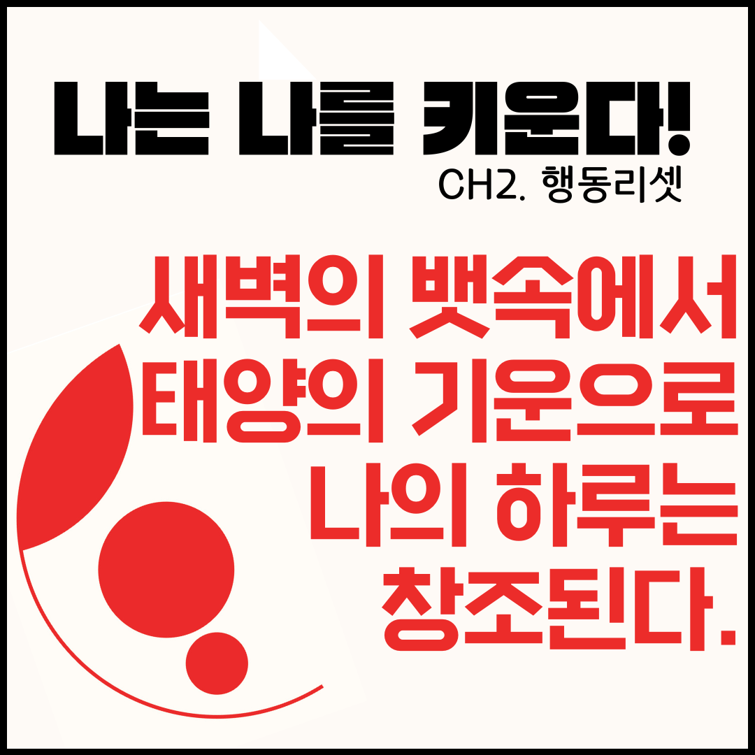 오늘은 행동리셋 10가지 가운데 6-새벽의 뱃속에서 태양의 기운으로 나의 하루는 창조된다 / 새벽에 무조건 일어나 를 풀어보고자 한다.