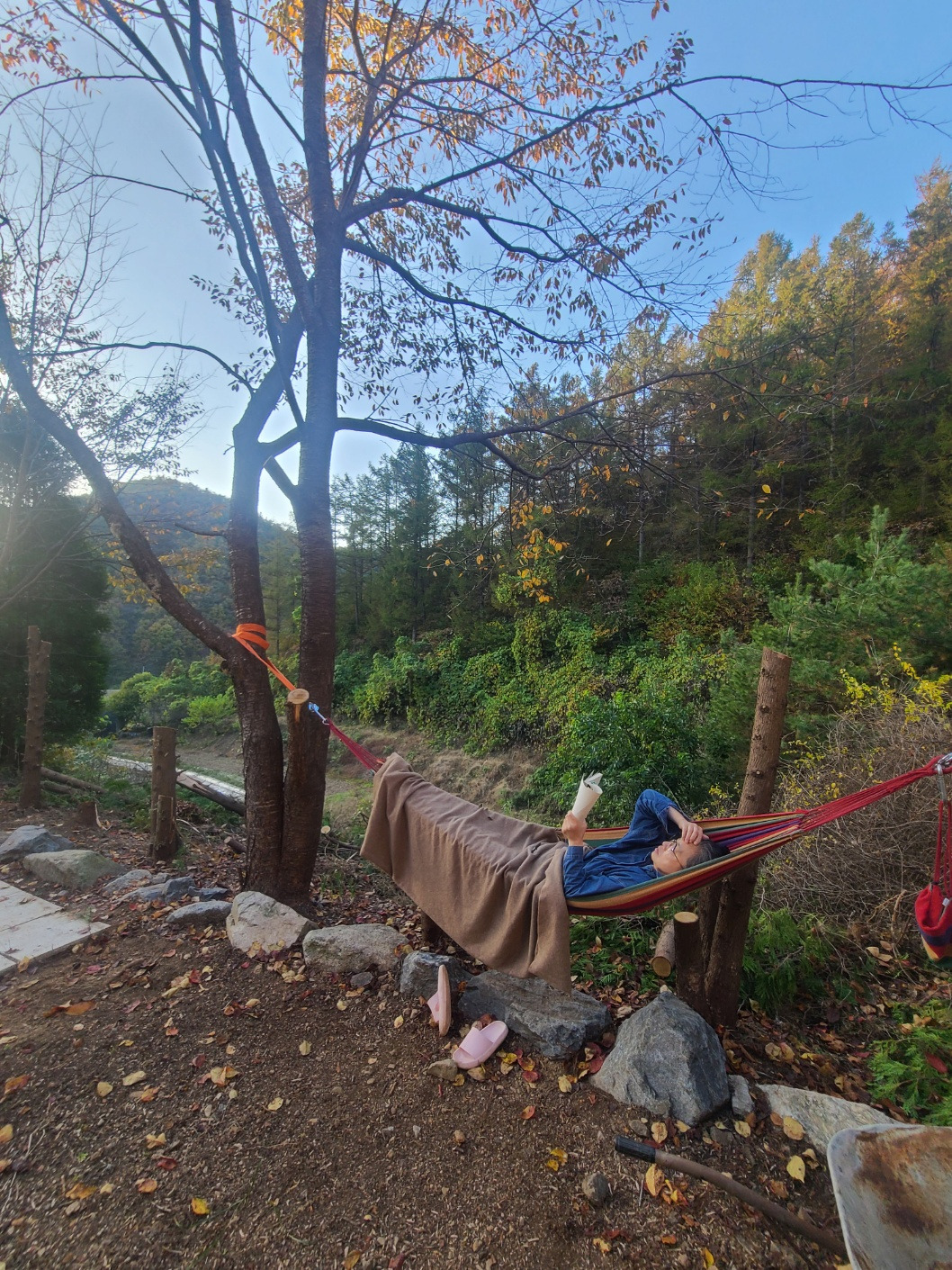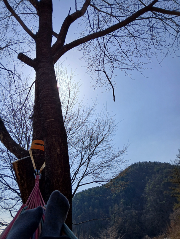 벗나무들 사이에 걸어놓은 해먹에 누우면