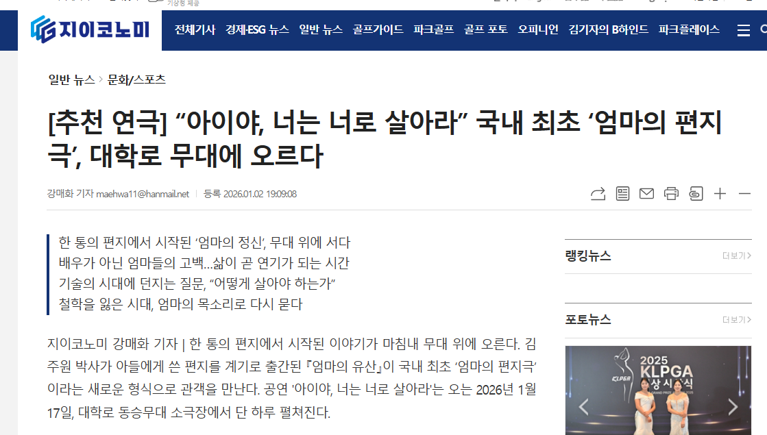 국내 최초 [엄마의 편지극]이라는 장르를 개척하고 철학이 사라진 시대, 자녀에게 삶의 근본을 엄마의 목소리로 직접 들려주며 대화가 사라진 시대, 직접 손편지를 쓰는 현장을 공간에 담아내는 가열차고 모범적인 시도라 아니할 수 없다.