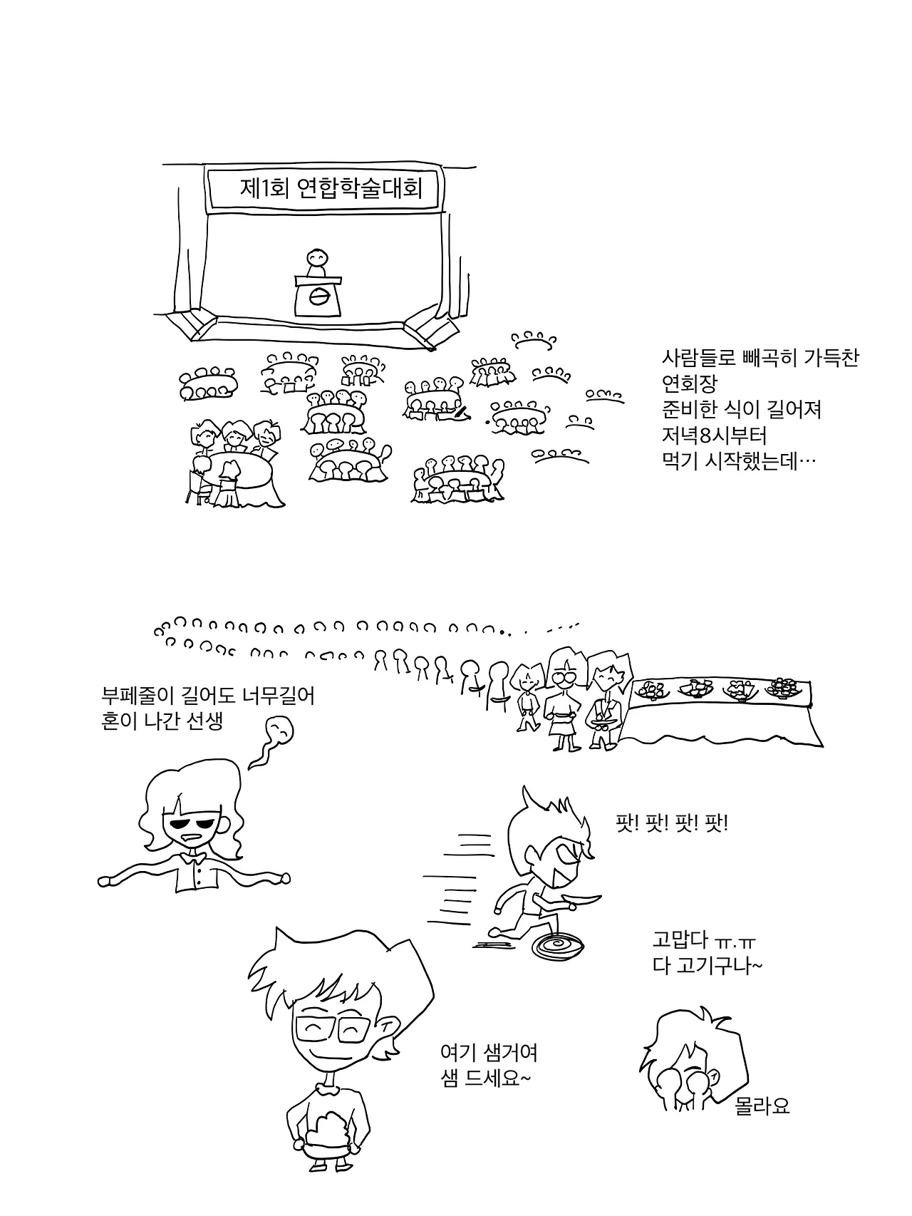 반도의 흔한 남고생들과 함께 학회에 포스터 발표 하러 간 날, 따뜻한 순간이었다. 가족적인 분위기 학회로, 축제 같은 분위기에 많은 사람들이 모였다. 발표가 길어지고 축하 행사까지 겹쳐 저녁식사는 여덟시가 되어서야 시작됐다. 사람들로 빼곡히 가득찼다. 저녁으로 부페가 준비 되었는데, 부페 줄이 길어도 너무 길었다.