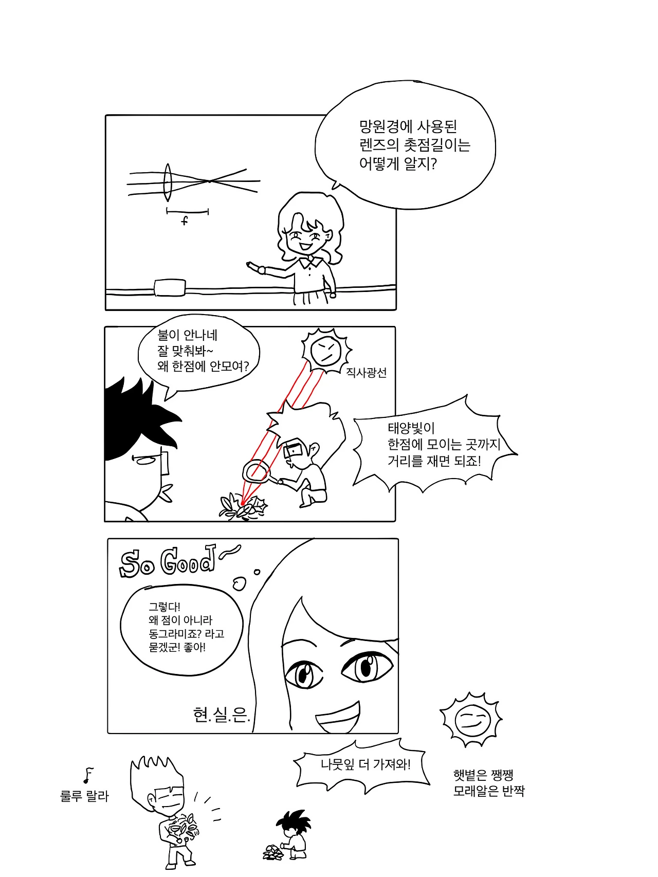 질문 유도할 때도 있지만, 야외에서 실험을 할 때도 있다. 렌즈의 초점길이를 알아내는 실험인데, 밖에서 실험해 보고 싶으면 그렇게 하라고 한다. 렌즈로 태양빛을 모으는 실험인데, 이게 정말 반응이 뜨겁다. 반도의 흔한 고등학생들도 좋아한다. 아니, 무척 좋아한다. 대체 왜 이렇게 좋아하는지 잘 모르겠다. 빛의 집광 원리를 이해해서? 아니면 나뭇잎에 불을 낼 수 있다는 생각에 신이 나서? 어쩌면 그냥 수업 시간에 밖에 나가는게 좋아서? 모르겠다. 어쨌든 이 실험만 하면 아이들 눈이 반짝이고 시끌벅적해 진다.