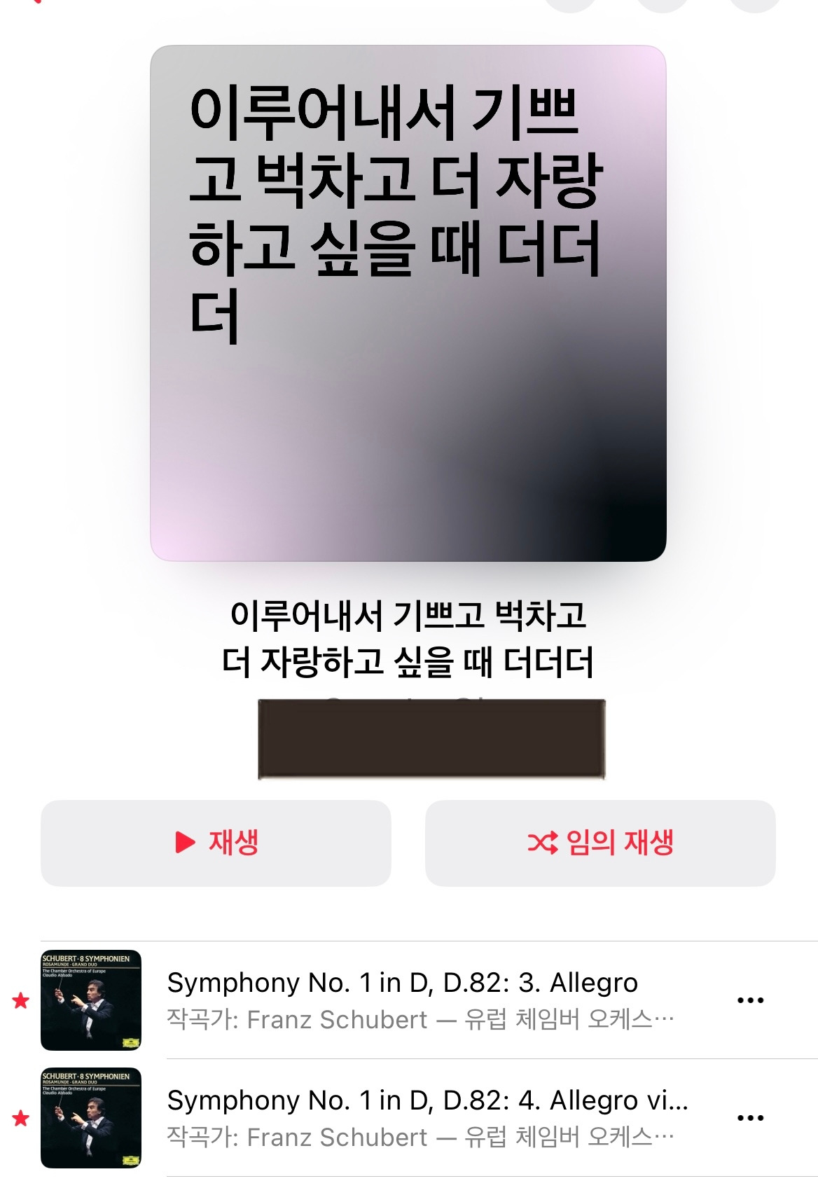 슈베르트 교향곡 제1번의 3악장과 4악장은 무언가를 이루었을 때의 뿌듯함, 기쁘고 기쁜 기분이 들었다. 이대로 계속 잘 될 것 같은 기분. 공연을 보고 난 뒤, “이루어내서 기쁘고 벅차고 더 자랑하고 싶을 때 더더더” 제목의 플레이리스트를 만들어 두 곡을 넣어 두었다. 지금 쓰고 있는 책이 연말에 나오면, 이 플레이리스트를 들을 것이다.