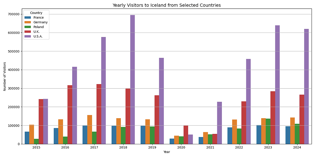관광객 국적을 살펴보면, 가장 많은 방문객은 미국, 영국, 독일, 프랑스, 폴란드 순이다. 이중 폴란드는 조금 특별하다. 아이슬란드 전체 인구의 약 6%가 폴란드 출신으로, 아이슬란드인 다음으로 많은 외국인 집단이다.