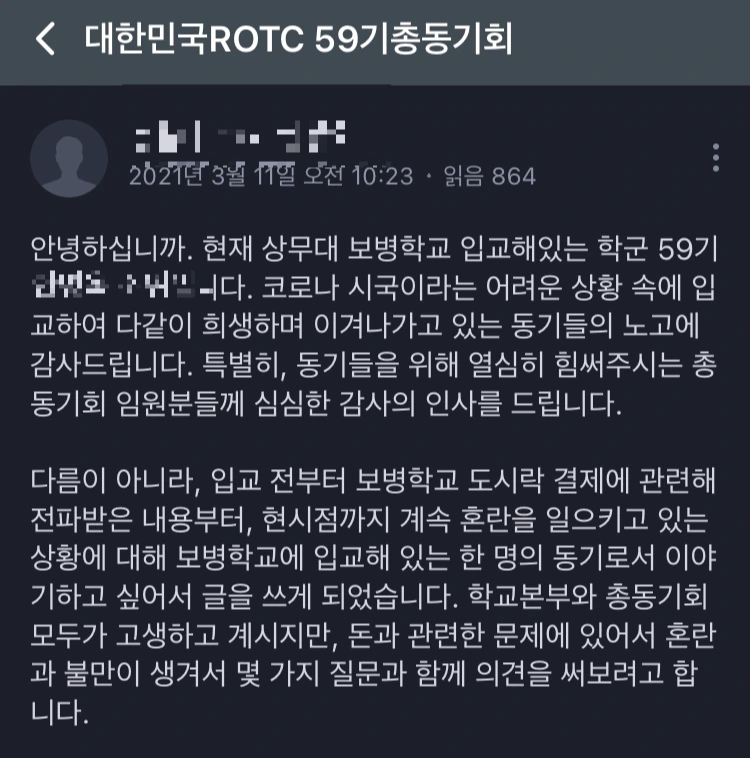 격리하던 중 하나의 에피소드가 있었다. 격리를 하면서 매 끼니를 도시락을 먹게 되었다. 도시락은 영내에 있을 때 추진 보급된 것이 아니라, 매 끼니마다 금액을 지불하며 업체를 통해 배달을 받아서 추진되었다. 이러한 상황에 대해 통보를 받게 되었고, 지원받는 금액도 공지가 될 때마다 달라졌다. 나는 갓 임관해서 월급을 받으며 예산 사용과 관련된 경제적 관심이 많은 상태에서, 타 병과들보다 유독 많은 금액을 지불하며 만족스럽지 못한 식사를 하게 되고, 그것에 대해 의견을 구하거나 정확하게 통제받지 못하는 상황이 불만스러웠다. 내 주변의 대부분의 동기들도 비슷한 의견이었다. 그래서 ROTC 59기 총동창회 BAND를 통해 글을 남겼다. 현 상황에 대한 불만과 그에 대한 답변요구를 총동창회 임원단에게 전달했다. 문제가 근본적으로 해결되지는 못했지만, 구성원들의 불만사항을 전달하고 그를 통해 소통의 과정이 일부 진행되었다는 점에서는 만족스러웠다. 모두를 위해 고생하는 임원단들의 수고를 알지만, 의견을 전달하는 것이 더욱 건강하고 자유로운 소통이라고 생각했다. 이 자리를 빌어 당시에 수고해준 임원단 동기들에게 감사하고 미안한 마음을 전한다.