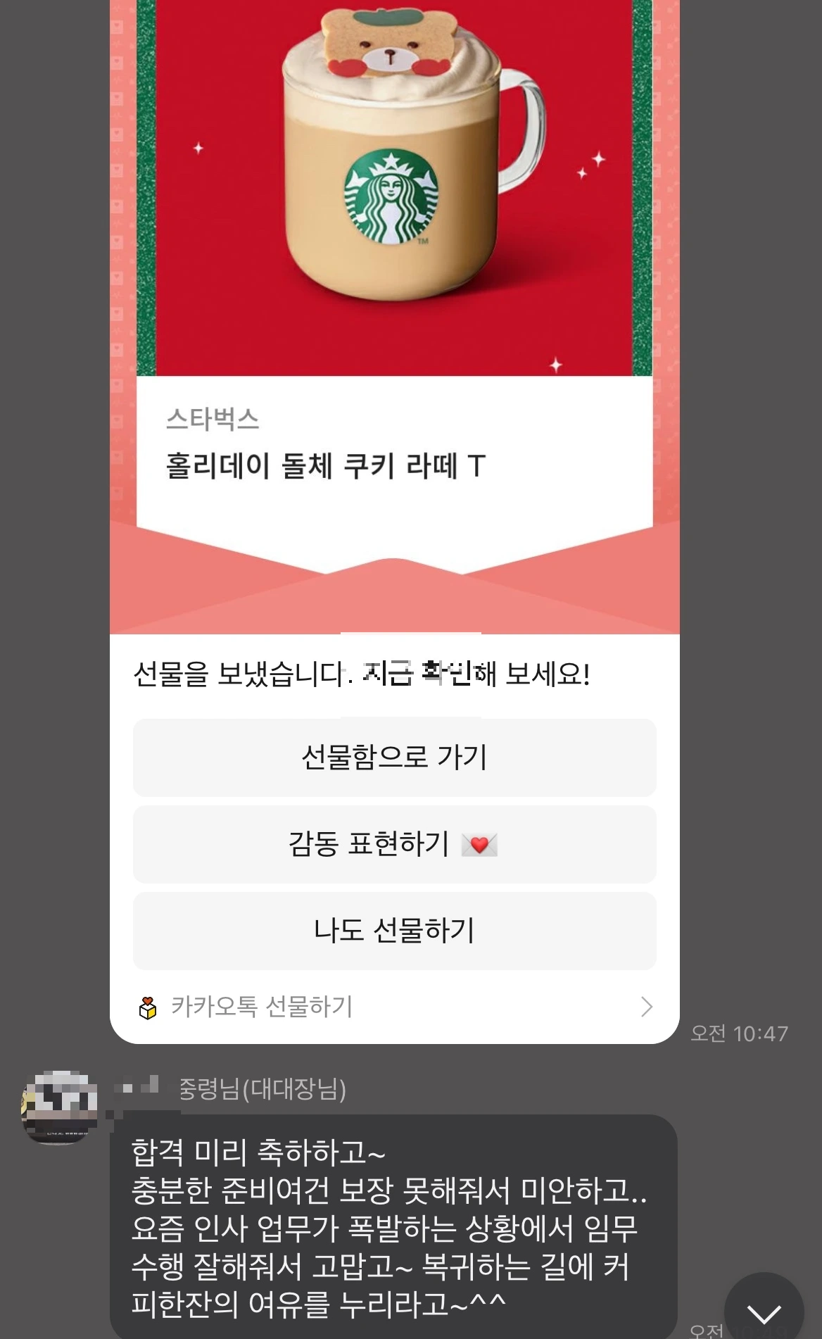 면접장으로 향하는 도중 대대장님께로부터 도착한 기프티콘 선물.