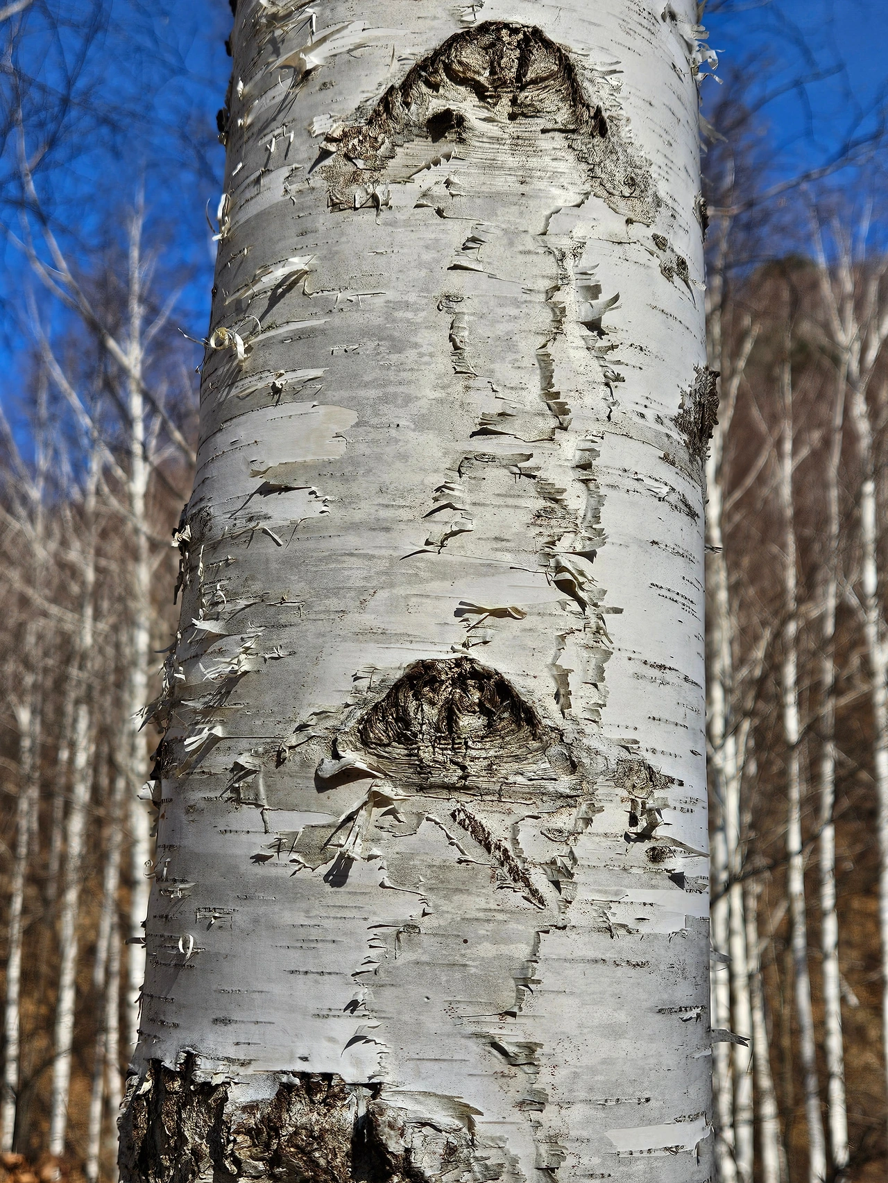 여기가 어디인가? 북유럽의 핀란드인가? 아니면 또 다른 이색 풍경이 있는 동화의 땅인가? 순백의 나무가 서로 경쟁하듯 하얀 피부를 자랑하며 하늘로 손을 뻗고 있다. 백색 나무의 끝자락을 가름하기엔 내 시야가 너무 멀다. 자작나무 뿌리부터 자세히 드려다 보니, 나무줄기에 온통 먹으로 수놓은 옹이의 그림이 이름난 화가의 작품처럼 아름답다. 그런가 하면, 연한 회백색 수피는 보일 듯 말 듯 속살 드러나는 실루엣처럼 흐릿한 윤곽만 드러내며 있는 듯 없는 듯 가늘게 가늘게 바람에 나부끼고 있다. 참으로 진기하고 신비하다. 나무의 껍질이 어떻게 이리도 얇을 수 있을까 경이롭기까지 하다. 질감을 느끼고 싶어 손으로 만져보니 너무나 매끈매끈하여 맞닿는 피부가 미끄러진다. 보드랍고 매끈하다는 표현이 적절할까 걱정스럽다.