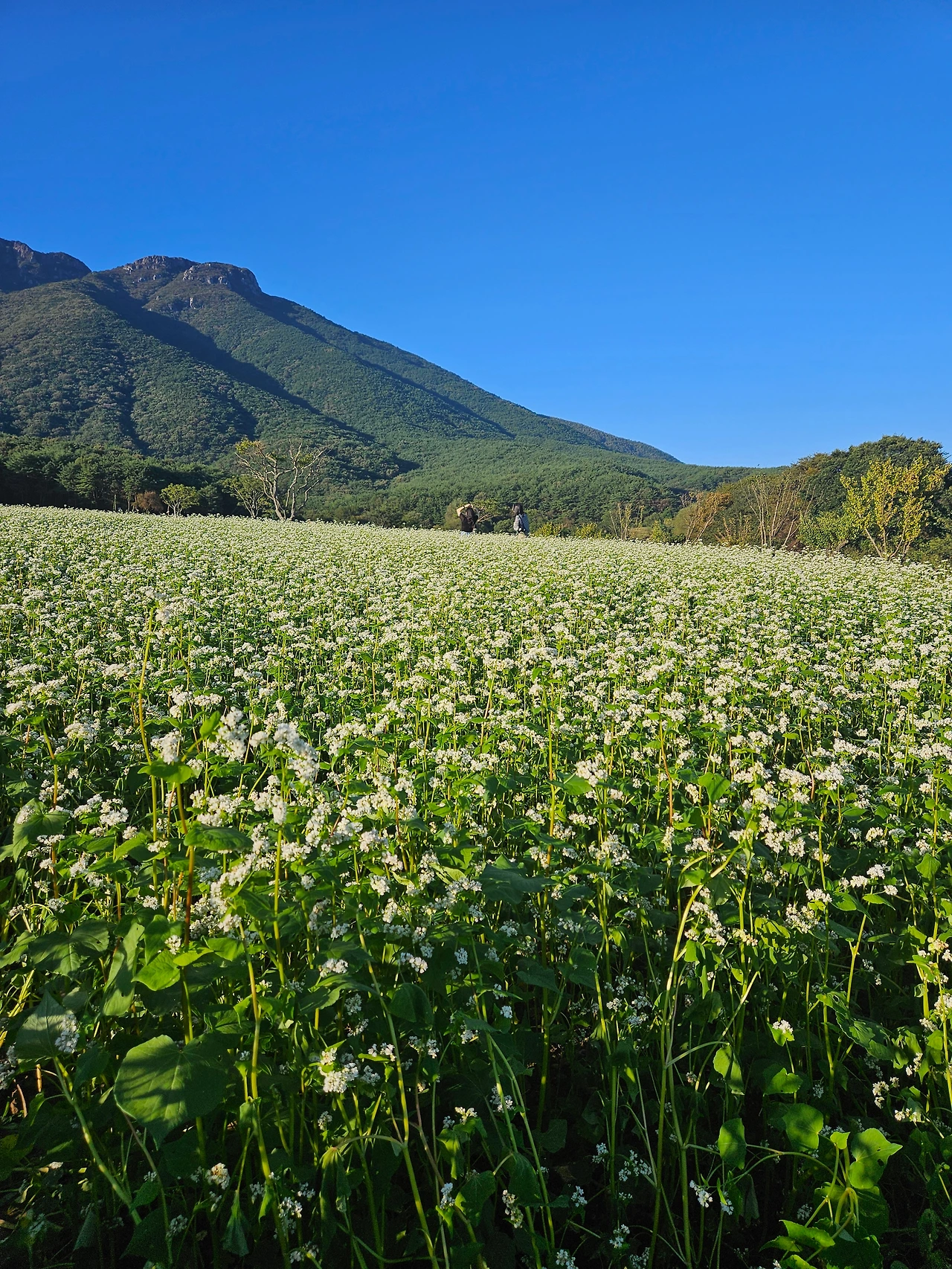 나의 마음은 지금 선계에 머물고 있는데, 마음을 이끄는 내 육신은 여전히 속세에 있으니, 산책 길에 소진한 에너지를 채우고픈 배고픔은 어찌할 수 없다. 통도사 절간식당에서 채개장으로 속세의 허기를 채우고 더 깊은 산속 암자로 들면, 산사의 풍광은 그저 한적한 시골일 뿐이다. 하지만 통도사 16 암자 중 미륵암 가는 길로 접어들어 굽이굽이 이어진 좁은 길을 따라가면 아하 어찌 여기에 저런 하면서 만나는 메밀밭이 나온다. 강원도 평창을 가지 않아도 되는 바로 그곳이다. 은은하게 밀려오는 풀 내음과 다르지 않지만 여리고 순한 향이 코를 자극하는 메밀 꽂을 마음껏 감상할 수 있다. 마치 푸른 잎사귀 사이사에 눈이 덮여 녹색과 흰색의 모자이크를 보는 것처럼 펼쳐진 벌판을 보는 장관이다. 멀리 산자락까지 하얀 물결이 출렁이고 메밀 향은 사방으로 퍼져 방문객의 마음마저 어린 시절로 향하게 순화시킨다. 아이가 되지 말래도 아이가 될 수밖에 없는 순수함을 자극한다.
