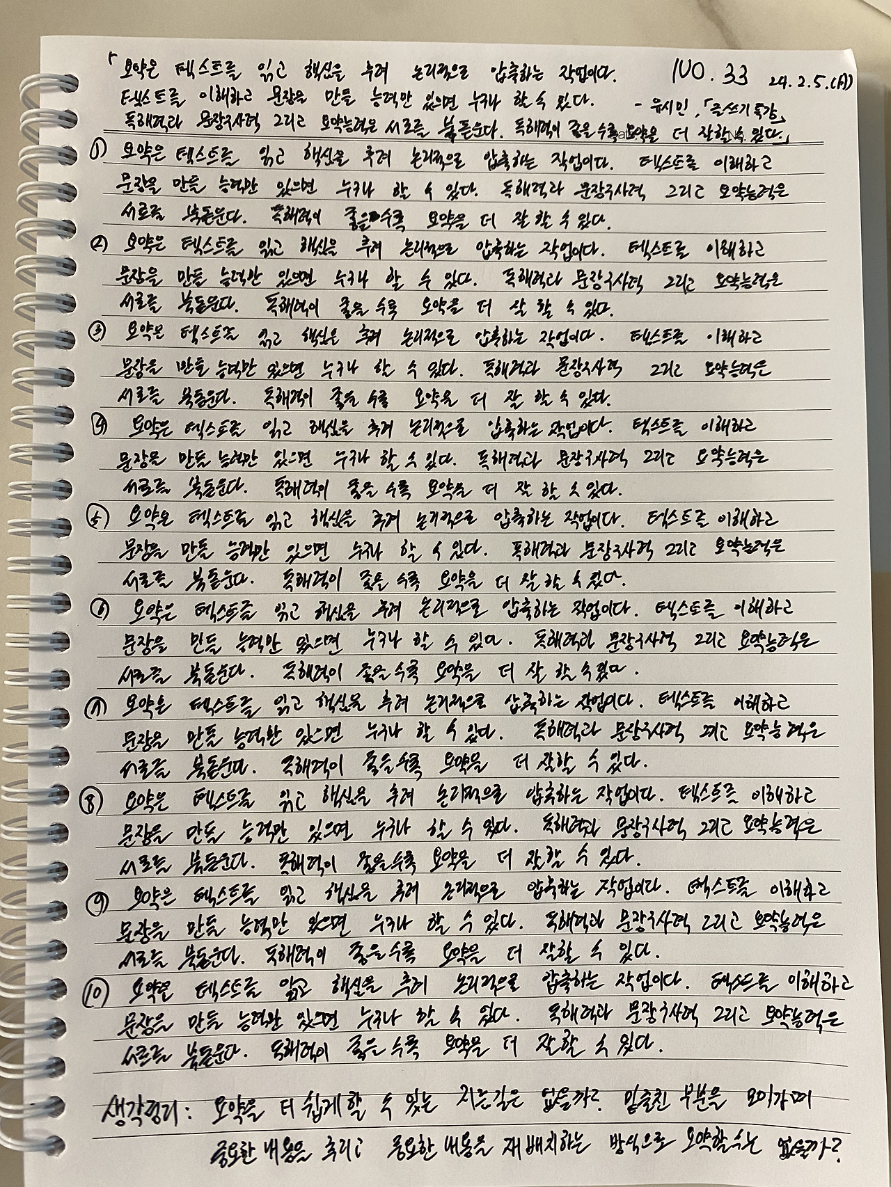 요약은 텍스트를 읽고 핵심을 추려 논리적으로 압축하는 작업이다. 텍스트를 이해하고 문장을 만들 능력만 있으면 누구나 할 수 있다. 독해력과 문장구사력 그리고 요약능력은 서로를 북돋운다. 독해력이 좋을수록 요약을 더 잘할 수 있다.