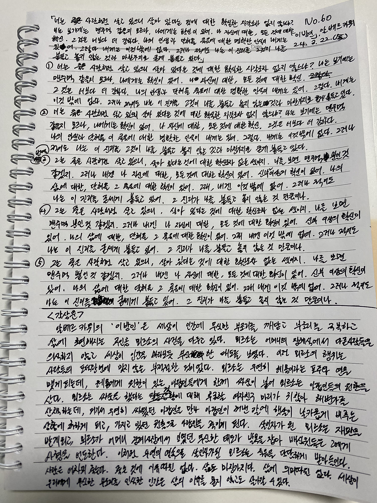 세상의 이치나 부조리를 깨닫는 건 아무래도 좋다. 나는 오늘 평범한 얼굴의 평범한 인생을 살아간다. 카뮈처럼 생기지도 않았고 그처럼 생각하지도 못하지만, 카뮈의 소설을 읽고, 같은 생각에 취하며 이렇게 이러쿵저러쿵 떠들어 댈 수 있으니 행복하다. '이방인'에 나오는 레스토랑 주인처럼 매일 방문하는 뫼르소를 바라보며 지긋이 그를 관찰할 수 있음에 감사하다.