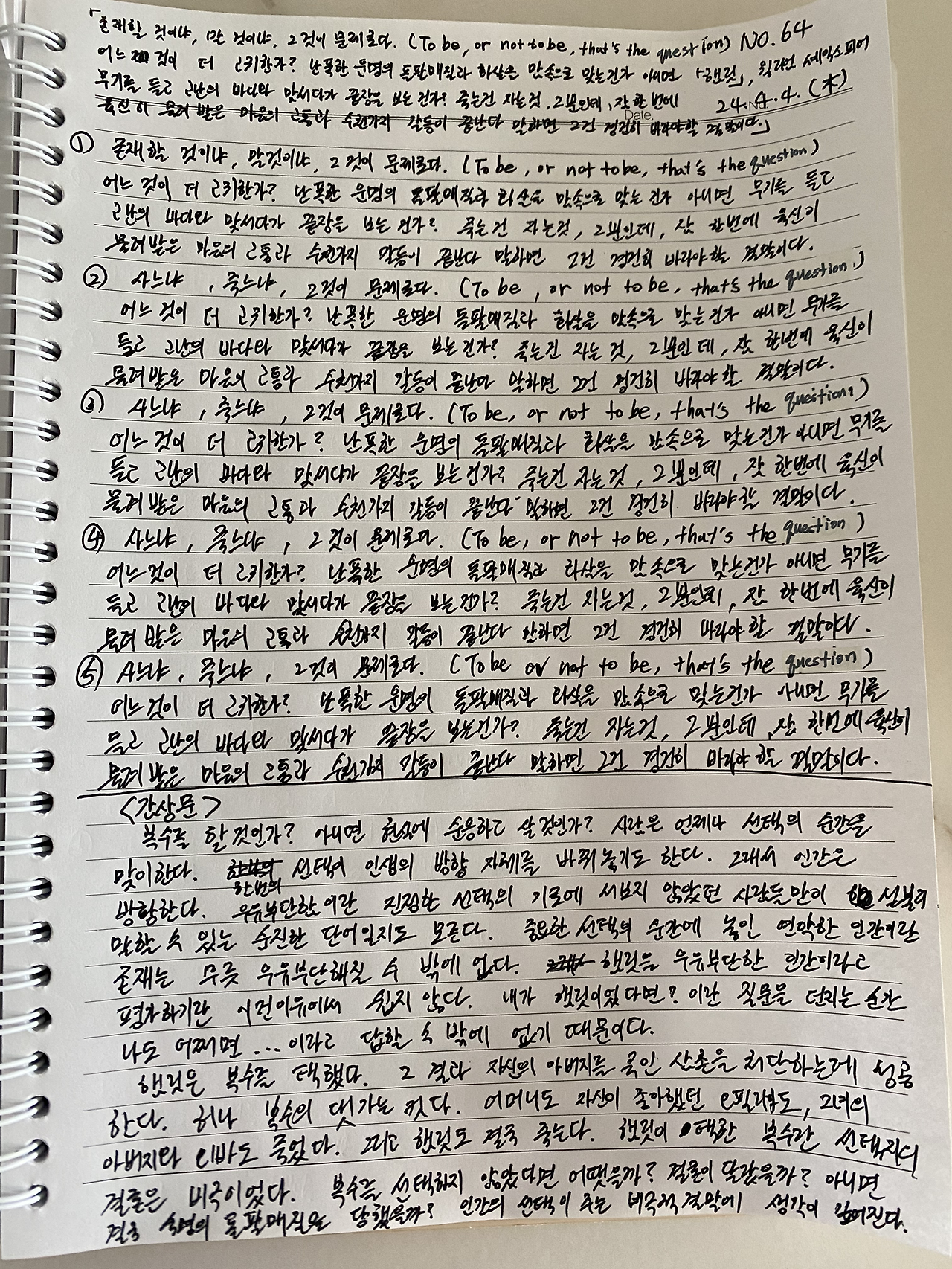 나는 햄릿을 보면서 인간의 선택이라는 점에 대해 생각해 보았다. 과연 인간이란 제대로 된 선택을 할 수 있는 존재일까? 이 질문은 현재도 논쟁적인 철학 주제인 '인간의 자유의지는 존재하는가?'라는 질문과 맥이 닿아있다. 햄릿은 사느냐 죽느냐 고뇌하며 복수를 할지 현재에 순응하며 살지를 선택해야 했다. 햄릿은 아버지를 죽인 삼촌의 기도를 들으며 여기서 삼촌을 죽여야 할지 말아야 할지 고민했다. 햄릿에게는 이렇게 두 번의 선택의 기회가 있었다. 독자들이 보았을 때 비극을 피할 수 있는 두 번의 기회가 있었던 것이다.