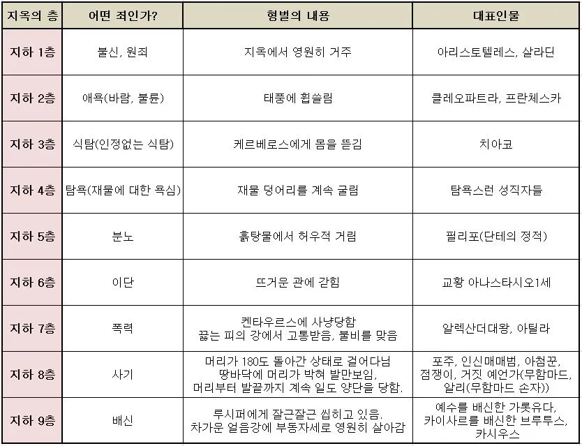 이게 단테 신곡-지옥편의 시놉시스다. 단테의 지옥여행기인 신곡-지옥편은 지옥의 세밀한 묘사와 더불어 생전 좋게든 나쁘게든 유명했던 사람들의 지옥살이를 묘사하며 독자의 흥미를 유발한다. 단테가 묘사한 지옥은 총 9개의 층으로 구성되어 있는데, 지하 1층에서 지하 9층으로 들어갈수록 죄질이 나쁘고 형벌이 고약해진다. 이 지옥을 분류해 보자면 다음과 같다.