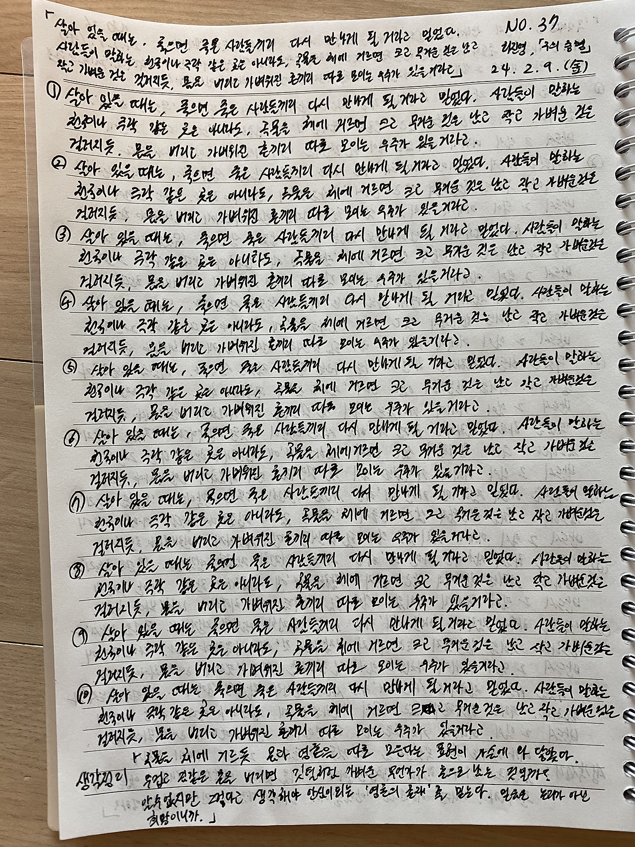 잘 살았는지는 내가 스스로 평가할 일이다. 남의 평가를 받으며 살 필요는 없고 오늘 하루 죽음 앞에 당당한지 물어보면 될 일이다. 하루하루 후회 없는 삶이란 내일 죽어도 적어도 오늘은 잘 살았다고 말할 수 있는 삶이다.
