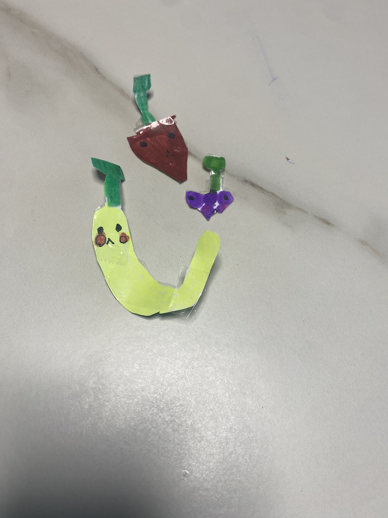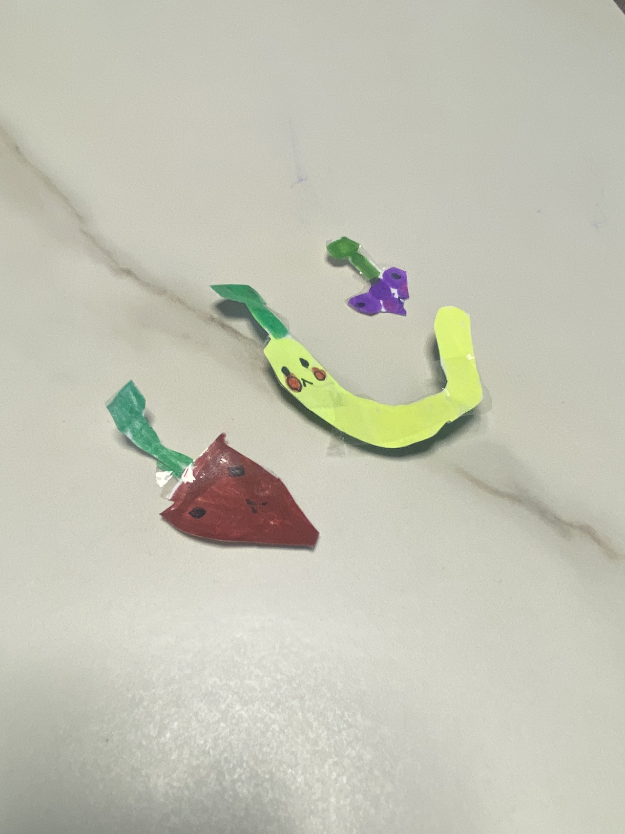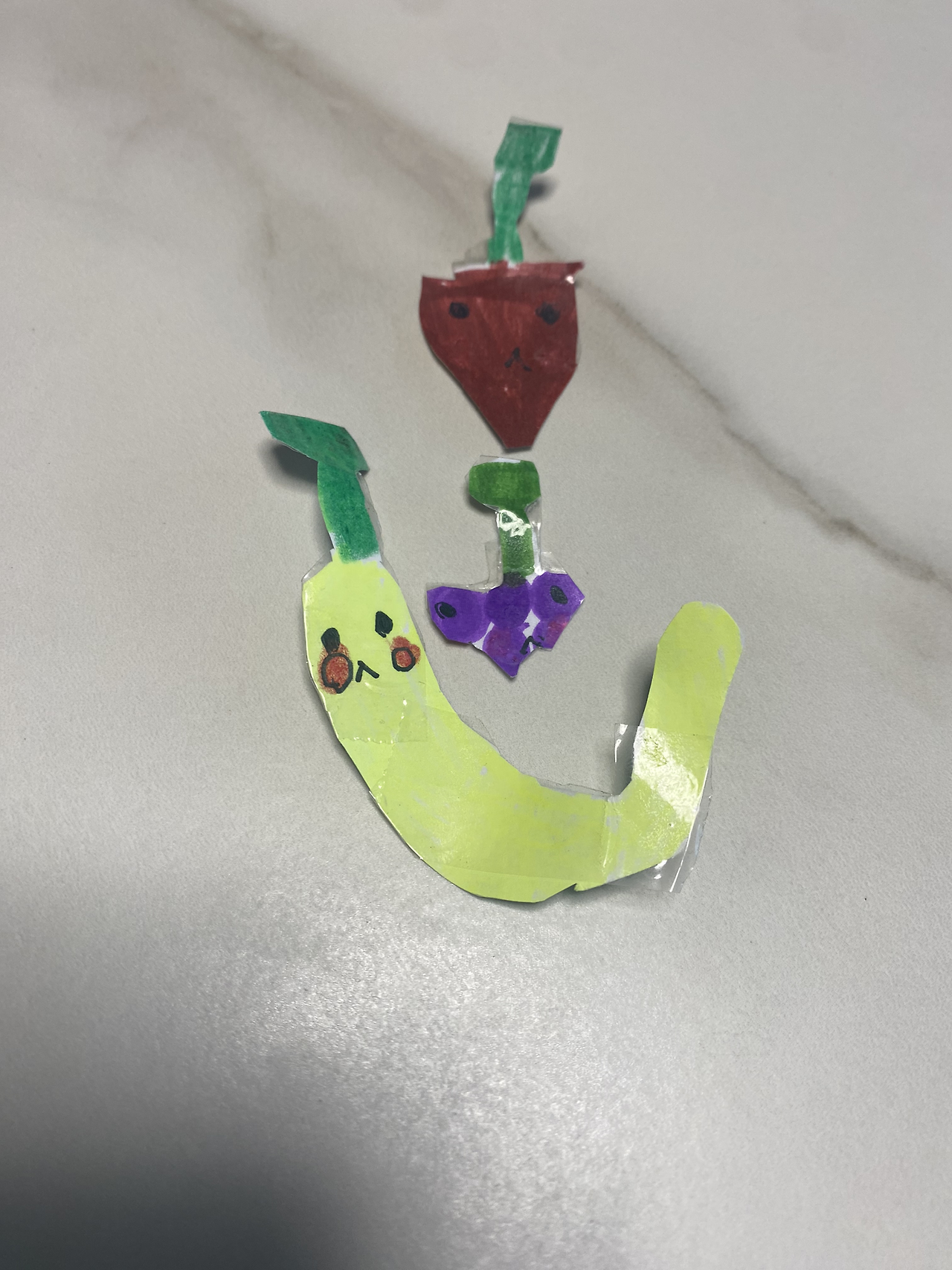 딸이 종이로 예쁜 딸기를 만들어왔습니다. 너무 예쁘다고 칭찬을 해주니 금세 바나나와 포도도 만들어왔네요.