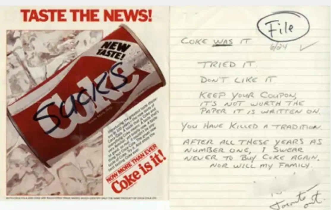 뉴코크의 출시는 기존의 코카콜라 팬들의 어마어마한 원성을 샀죠. "이게 뭐냐, 내게 진짜 콜라를 돌려달라!"는 고객들의 원성에 코카콜라는 자신의 잘못을 인정하고 뉴코크의 판매를 중단합니다.