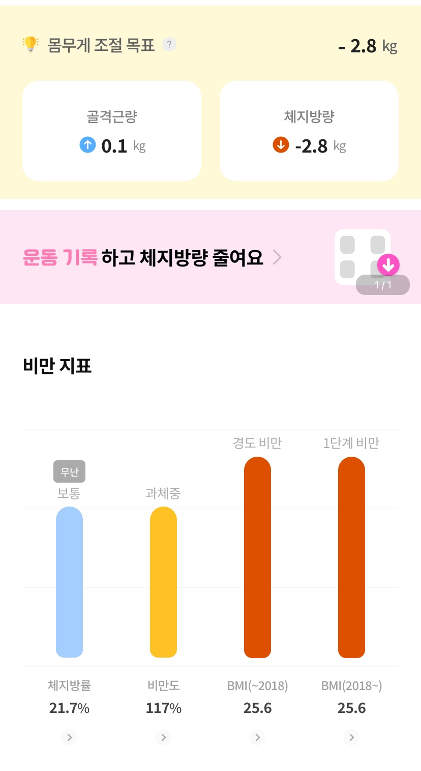 그나마 희망적이었던 것은 BMI 지표상으로는 완벽한 비만 상태이지만, 체지방률, 비만도 지표로 따지면 아직 비만 상태는 아니었다는 점이랄까요?