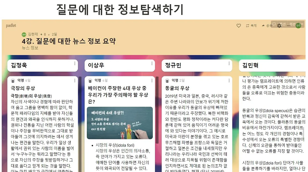 학생 발표 후 질문으로 "프란시스 베이컨의 4대 우상에서 자신이 가장 요즘 시대에 맞는 우상이 무엇인지 말하고 그 근거를 제시하라"는 질문을 하였다. 이에 따라 학생들은 진지한 모습으로 노트북으로 정보를 찾고 논문을 찾기 시작했다. 그리고 빅데이터 분석을 통해 뉴스 동향까지 확인했다. 그리고 그런 근거들 속에서 온라인 토론을 하고 이를 바탕으로 자신만의 칼럼을 쓰기 시작했다. 생각보다 학생들이 잘 따라하고 최종 글을 쓰는 것을 보면서 지도교사로써 재미있고 즐겁다는 생각이 들었다.