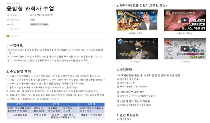 코로나가 시작된 후 겨울방학이 다가오는 어느 날! 교감선생님의 운명적인 부탁(?)을 받았습니다. 당시 과학부장이였는데 온라인 교과서 선도학교 사업에 지원하라는 것이었습니다. 이게 뭐지... 안한다고 버티기도 했지만 결국 선도학교에 지원하여 책임자로 운영하게 되었습니다ㅠ 처음에는 IT를 다루는 것에 하나도 모르겠고 굳이 지금까지 수업을 바꿔야 하나? 불만과 불평이 입밖으로 나오는 것을 겨우 겨우 참으며 젊은 선생님들의 도움을 받으며 하나씩 해갔습니다. 하지만 나에게 주어진 업무라는 짐이 점점 무거워져 도저히 피할 수 없었기에 겨울방학동안 심호흡을 한번 하면서 차근 차근 온라인 교과서를 만들었습니다. 노션이라는 프로그램은 원래 일정 정리하고 메모할 수 있고 콘텐츠를 삽입할 수 있는 프로그램인데 이를 교과서화시킬 수 있음을 알게 되었습니다. 그래서 유튜브와 홈페이지 자료를 참고하면서 기능을 배워갔고 만들어보게 되었습니다. 처음 만들어보는 교과서 웹페이지였지만 내가 원하는 대로 교과 내용을 구성하고 원하는 영상, 이미지 콘텐츠를 삽입할 수 있었습니다. ‘어? 내가 말하고 싶은 것은 온라인상으로 쉽게 할 수 있네??’ 처음에는 귀찮았지만 하나 하나 만들어가면서 과거 수업하면서 아쉬웠던 부분에 대해 바꿀 수 있다는 점이 점점 마음에 들었습니다. 더 깊이 들어가면 안된다고 소리치는 낭만교사와 새로운 것에 대한 호기심을 추구하는 과학교사 사이에 갈등하는 “대혼란의 멀티버스!!” ㅋ 결국 과학교사로써의 자아가 이겨 계속 만들게 되었습니다. ^-^