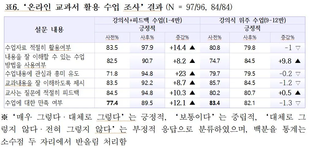 설문조사 결과 강의식+적극적 피드백한 수업(1-4반)은 온라인 교과서 활용한 수업에서도 모든 설문문항에서 상승하였음을 볼 수 있었고 전통적인 강의식 수업(9-12반)에서는 설문문항에서 비슷하거나 수업방법 사용여부 정도만 상승했다. 따라서 온라인 교과서 활용 수업 설계시 학생들이 교사 피드백을 원한다는 것을 알 수 있다. 그리고 온라인 교과서를 활용하지 않았을 때는 강의식 수업이 강의식+피드백 수업보다 수업만족도가 높았지만 온라인 교과서를 활용할 때 강의식 수업은 별 차이가 없는 것에 비해 강의식+피드백 수업의 학습만족도가 12.1% 상승함을 알 수 있었다.