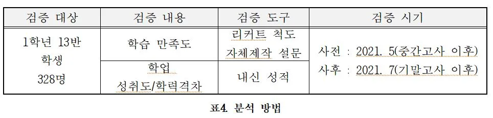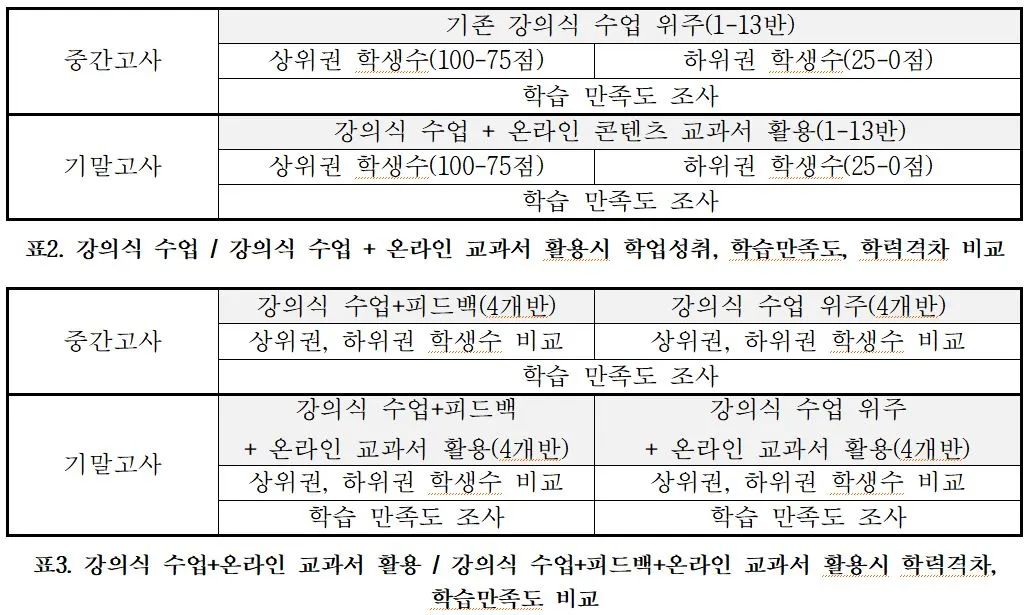 중간고사때는 기존 강의식 수업 위주로 진행하고 기말고사때 강의식 수업 + 온라인 콘텐츠 교과서 활용 수업을 병행하였다. 이를 통해 중간고사 성적과 기말고사 성적을 비교하여 학업성취, 학습만족도, 학력격차 등을 분석하였다. 또한 강의식 수업 + 적극적 피드백 반과 강의식 수업 위주로 진행된 반에 대한 학력격차, 학습만족도 등을 비교 분석하였다.