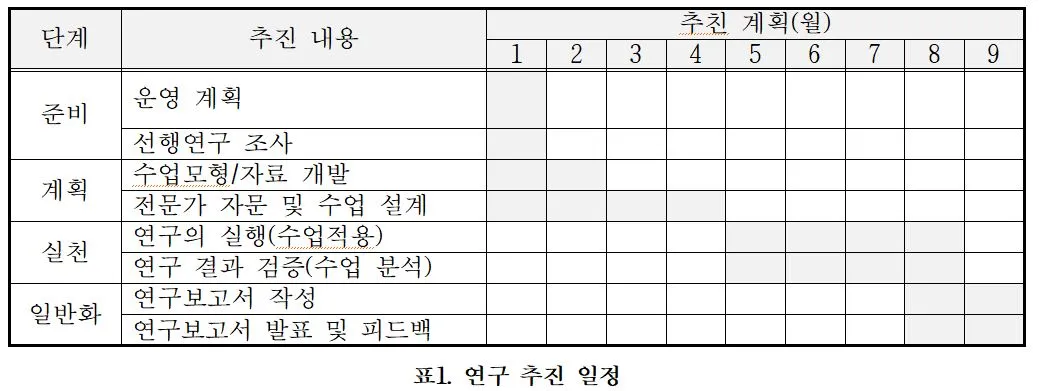 먼저, 2020년 12월 – 2021년 1월의 약 2개월에 걸쳐 교원학습공동체 활동을 통해 선행 연구조사와 온라인 콘텐츠 교과서를 활용한 고등학교 통합과학 수업설계를 하였다. 둘째, 수업 모형에 맞게 수업 자료를 개발했고 수업 모형 타당성을 대학 교수 등 전문가 패널들을 통해 검증받았다. 셋째, 온라인 콘텐츠 교과서를 통합과학 수업에 적용하여 그 효과성을 분석하고 그 결과를 근거로 온라인 콘텐츠 교과서를 활용한 고등학교 과학수업의 시사점을 도출한다. 운영기간은 2021학년도 1학기(3월 – 7월)로 1-7주차 수업에는 기존의 강의식 수업(7주, 28시수)으로 진행하고 중간고사 시험 이후에 강의식 수업에 온라인 교과서와 크롬북을 활용한 수업(7주, 28시수)를 진행하여 기말고사 시험을 보고 학습만족도, 학업성취도, 학력격차 정도를 평가한다. 통합과학 수업에 물리, 화학, 생물, 지구과학 총 7명의 과학선생님이 함께 반을 나누어 수업을 진행하였다.