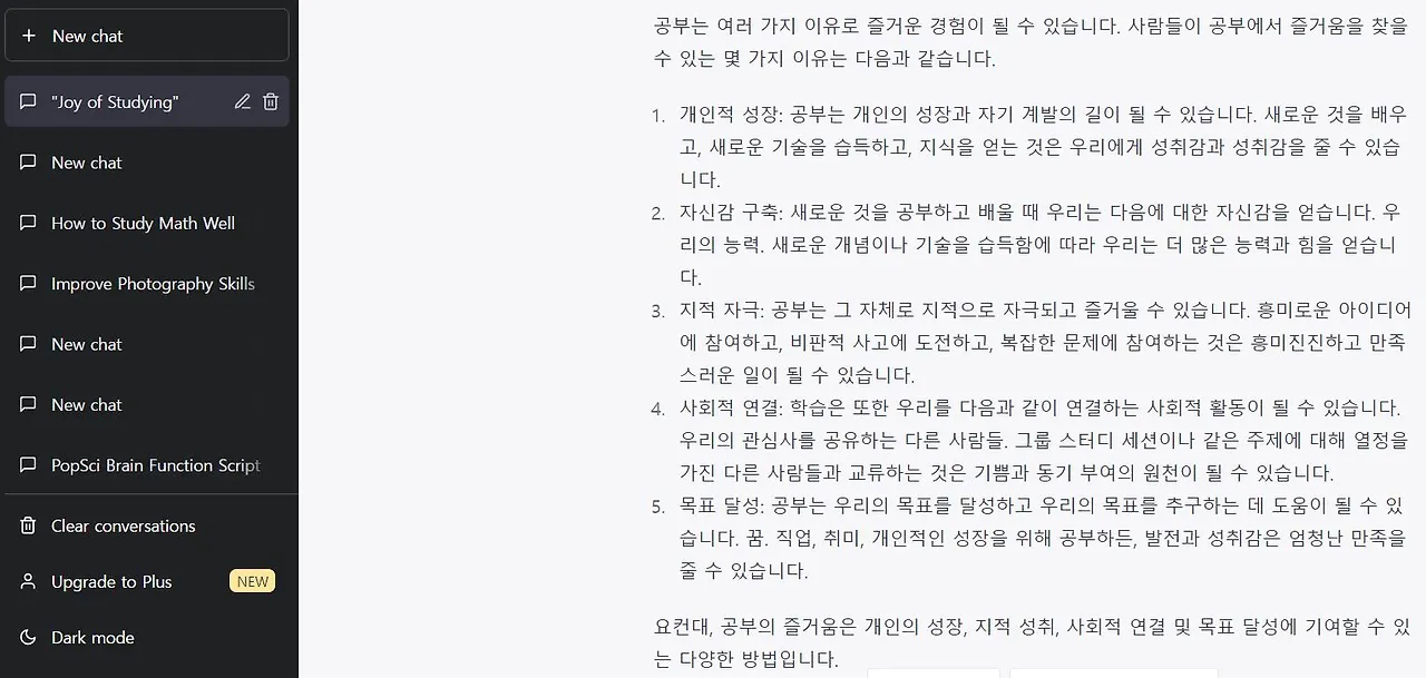 이런 방식으로 설명하면 과연 학생들이 설득될까? 이런 강의 내용, 설명은 기성세대에게나 설득되었던 방식은 아닐까? 문득 그런 생각이 들었다. 아이들에게 고등학교에 와서 공부의 즐거움을 느끼게 해 주면 스스로 자발적으로 하지 않을까? 그렇다면 아이들이 정말 공부가 즐겁다고 느끼는 것은 무엇일까? 다양한 질문이 생각났다. 그래서 요즘 핫이슈인 ChatGPT에게 질문했다. 초거대 AI 시스템으로 전인류의 지적 정보를 학습한 인공지능은 이런 질문에 무엇이라고 답변할까? 궁금했다.