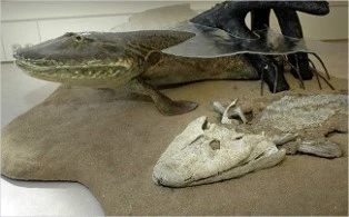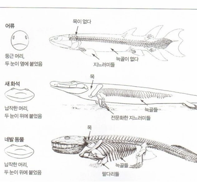 (1)비늘과 지느러미가 있지만 육상동물처럼 머리가 납작 목을 지님, (2)위팔과 아래팔, (3) 뼈와 관절을 가짐