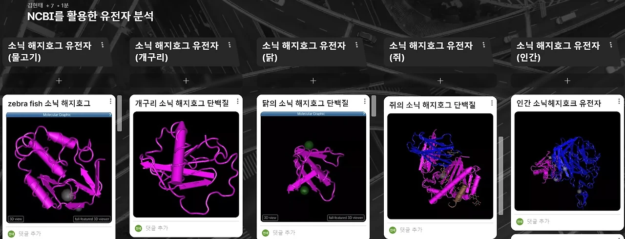결론 : 좀 이해하기 어려운 책이었지만 학생들과 다들 열심히 읽고 조사하고 탐구하면서 재미있는 시간이 되었다. 특히 유전자 서열, 아미노산 비교, 단백질 구조를 비교하면서 책 내용에 대해 더욱 잘 이해하는 시간이었다. 그리고 이를 통한 각자의 생각으로 글쓰기를 할 때 더욱 풍성한 시간이 되었다