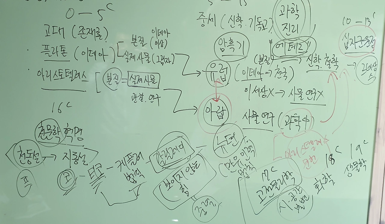먼저, 전체 세계사적 흐름을 잡고 시작해보자 5세기까지는 고대 그리스 철학자 플라톤과 아리스토텔레스가 나오는데 둘은 사물의 본질이 다르다고 했어 플라톤은 사물의 본질은 이데아라는 새로운 곳에 있고 우리가 보는 사물은 그 이데아의 그림자로 생각했지 하지만 아리스토텔레스는 사물의 본질은 사물 안에 있다고 생각했어 이런 철학적 사상은 중세에 큰 영향을 미치는데 플라톤의 철학은 중세 신학과 맞물려 점점 과학과 실용에서 벗어나 형이상학적이고 추상적으로 빠지게 되었고 사물의 본질을 탐구하는 아리스토텔레스 철학은 이슬람 지역에 영향을 주어 과학과 기술이 발전하게 돼 그러다가 12-13세기에 십자가 원정으로 인해 유럽은 이슬람 나라의 과학 기술의 발전을 보고 충격을 받고 그 과학, 기술을 받아들이게 되고 이를 통해 르네상스 혁명이 일어나게 돼 그리고 16세기부터 과학혁명기가 나타나는데 16세기 천문학의 혁명(천동설이 지동설로 바뀜 : 코페르니쿠스 -> 티코 -> 케플러 -> 갈릴레이 -> 뉴턴), 17세기 물리학의 혁명(뉴턴의 고전물리학), 18세기 화학혁명(라부아지에의 질량 보존의 법칙, 연소 등), 19세기 생물학의 혁명(다윈의 종의 기원 등)이 일어난다. 그리고 20세기에 휘어진 시대의 내용으로 많은 과학자들의 업적이 나온다.