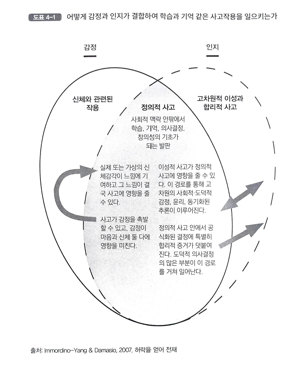 항해할 때 노를 저어 배를 이끌듯이 감정은 피험자의 학습을 인도한다. 감정이나 감정이 미치는 영향은 눈에 보이지는 않지만 장기적으로 학습자가 취하는 의사결정과 행동의 방향을 안정시키는 힘이 있다. 감정은 결정이나 어떤 수학 공식을 적용할지 고민할 때 그와 관련된 지식을 불러내는데 안내자 역할을 한다. 그림에서 실선으로 된 타원은 감정을 나타내고 점선으로 된 타원은 인지를 나타낸다. 두 개의 타원이 겹치는 영역은 '정의적 사고'영역을 보여준다.