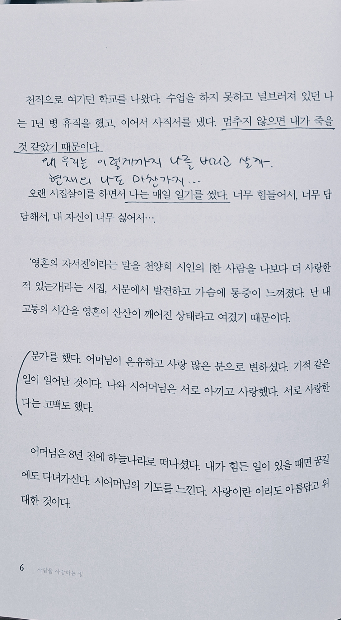 저자는 말한다. 사랑은 완벽한 상태가 아니라, 무너졌다가도 다시 일어나는 '회복의 여정' 그 자체라고. 아이들의 맑은 눈망울에서 '억지로가 아닌 할 수 있을 만큼의 사랑'을 배웠다는 대목에서 나는 비로소 숨을 크게 들이마셨다. 27년 차 강사인 나에게도, 누군가의 맏이인 나에게도 필요했던 건 '애쓰는 사랑'이 아니라 '자연스러운 사랑'이었음을 깨달았기 때문이다.
