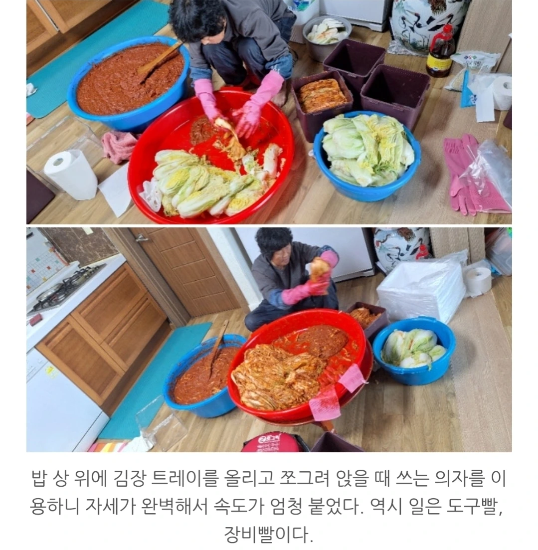 밥상을 물리고 나는 어제 미리 샀던 고무장갑을 끼고 작업복으로 환복도 마쳤다. 엄마와 나는 버무리고 아버지는 배추를 옮겨 주셨다. 배추가 없다더니 사지도 않고 어떻게 구했냐니까 아는 댁에서 40포기를 무료로 주셨단다. 아이고 감사해라. 돈을 드렸지만 한사코 만류하시다가 결국은 엄마 손으로 돌아왔단다. 대신 나중에 식사를 대접하기로 하셨단다. 역시 정이 철철 넘치는 고향 마을이다.