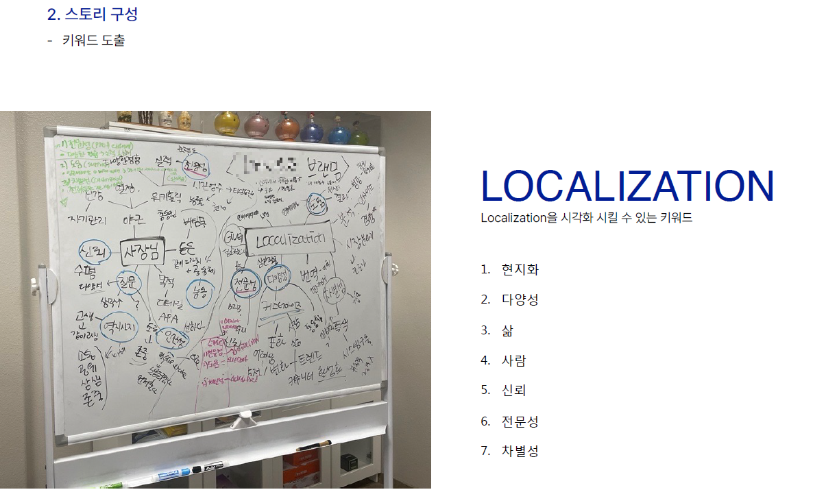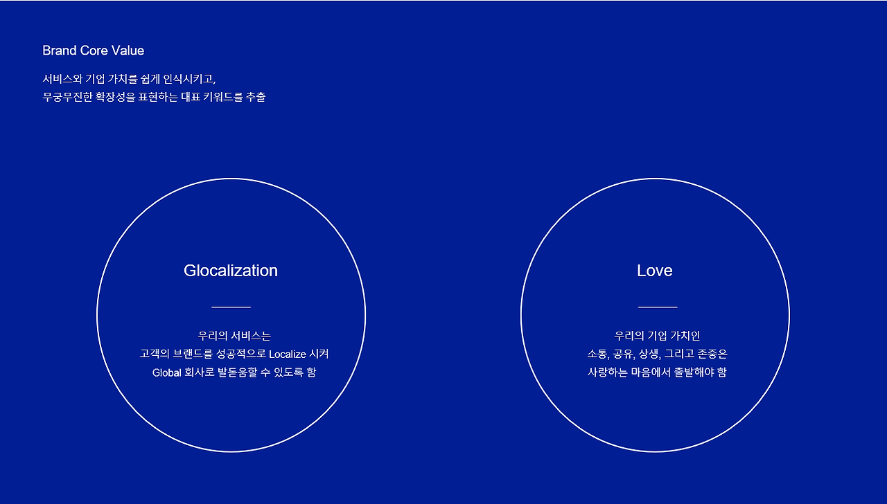 한국브랜드를 미국에 성공적으로 진출할 수 있도록 돕는, 'Incubating'의 정체성을 갖고 있는 회사를 가장 잘 표현할 수 있는 키워드로 'Localization (현지화)'를 꼽았으며 이 키워드를 실현할 수 있도록 우리 회사가 추구해야 하는 가치로서 'Glocalization'와 'Love'를 선정할 수 있었다.
