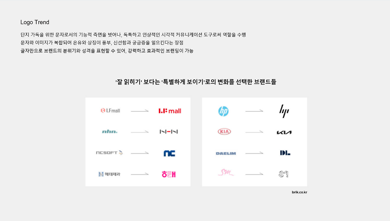 로고 디자인의 현재 트렌드 또한, 흐름을 따라가야 하는 숙명을 가진 영리 기업으로써 파악해야만 하는 부분이다. 우리의 Simplification의 컨셉을 밑받침해 주는 근거가 되기도 했던 부분이기에 PT를 했을 때도 언급을 했는데, 실제로 많은 대기업들이 담백한 타이포 위주의 잘 읽히는 정직함을 추구하는 게 아닌 특별하고 심플한 로고로 변화를 하고 있다는 것을 볼 수 있었다.