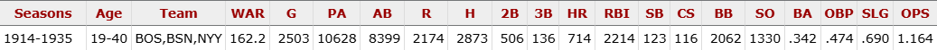 먼저 베이브 루스의 통산 WAR(승리기여도)는 베이스볼레퍼런스기준으로 182.6 팬그래프기준으로 179.4로 두 곳에서 다 역대 1위입니다 보통 명예의 전당에 입성하는 기준을 60쯤으로 잡는다는 것을 보면 약 3배에 이르는 어마어마한 값이죠.